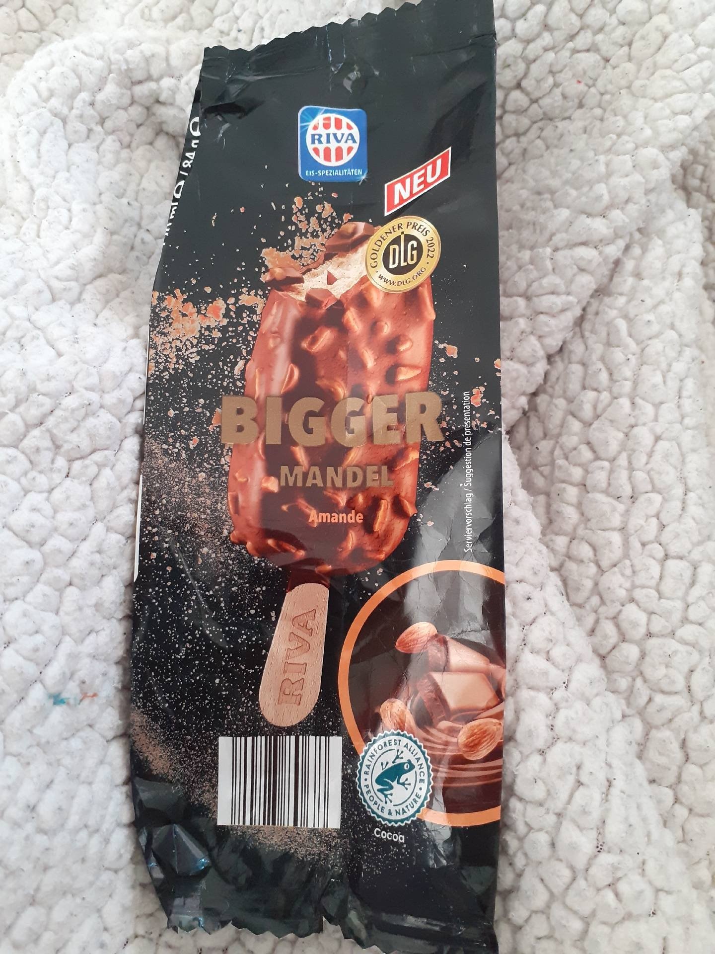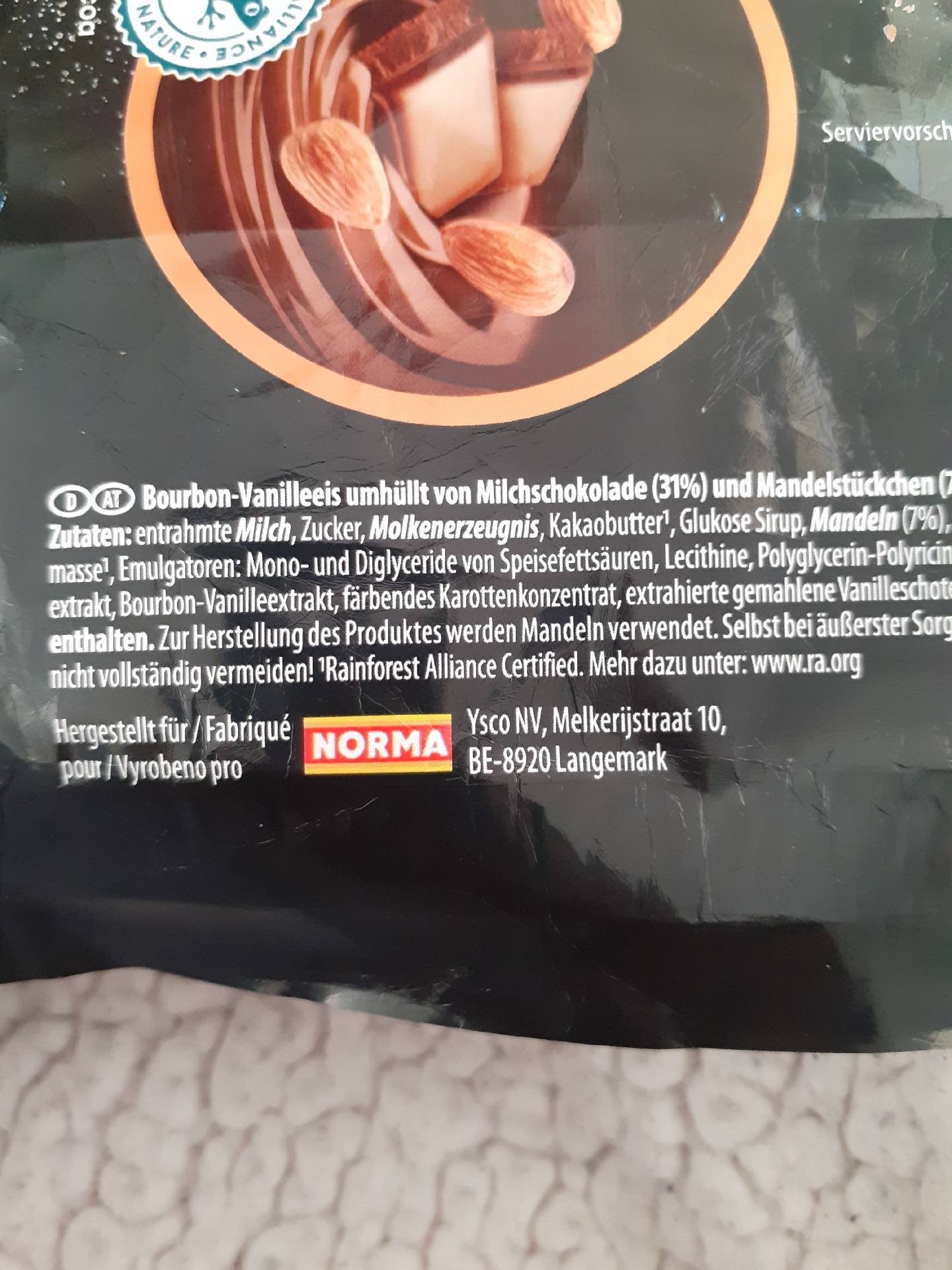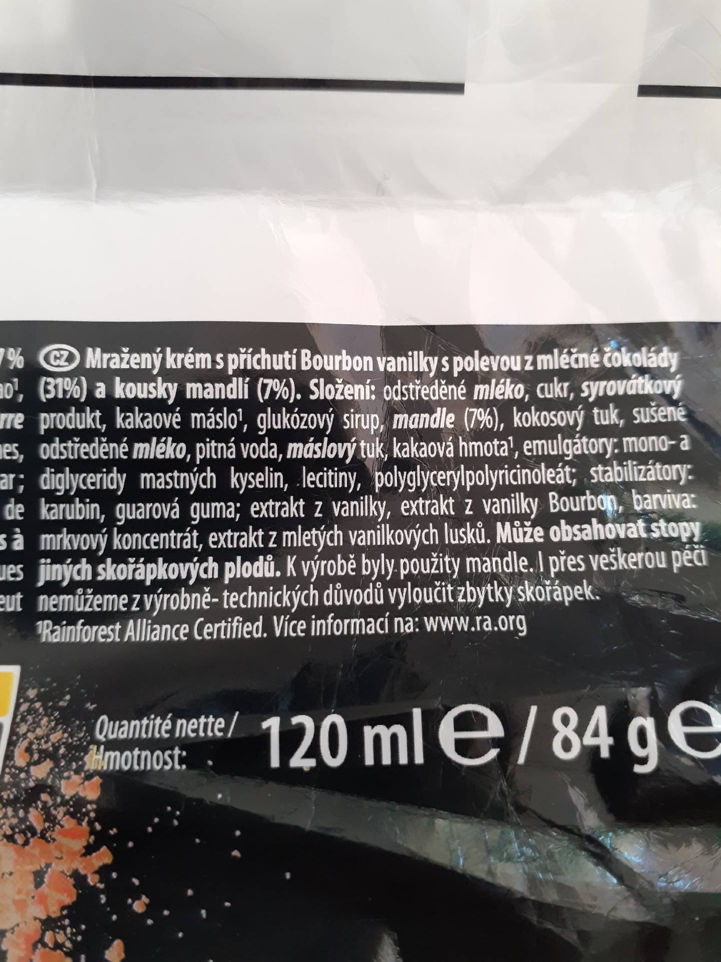 Mražený krém s příchutí Bourbon vanilky s polevou z mléčné čokolády 31% a kousky mandlí 7%