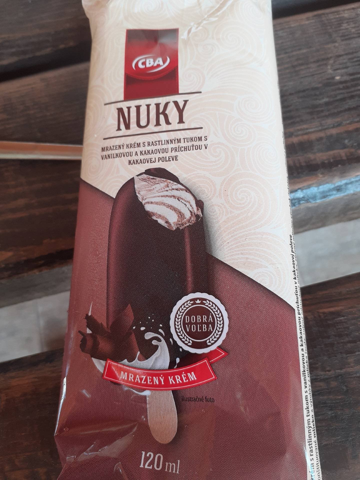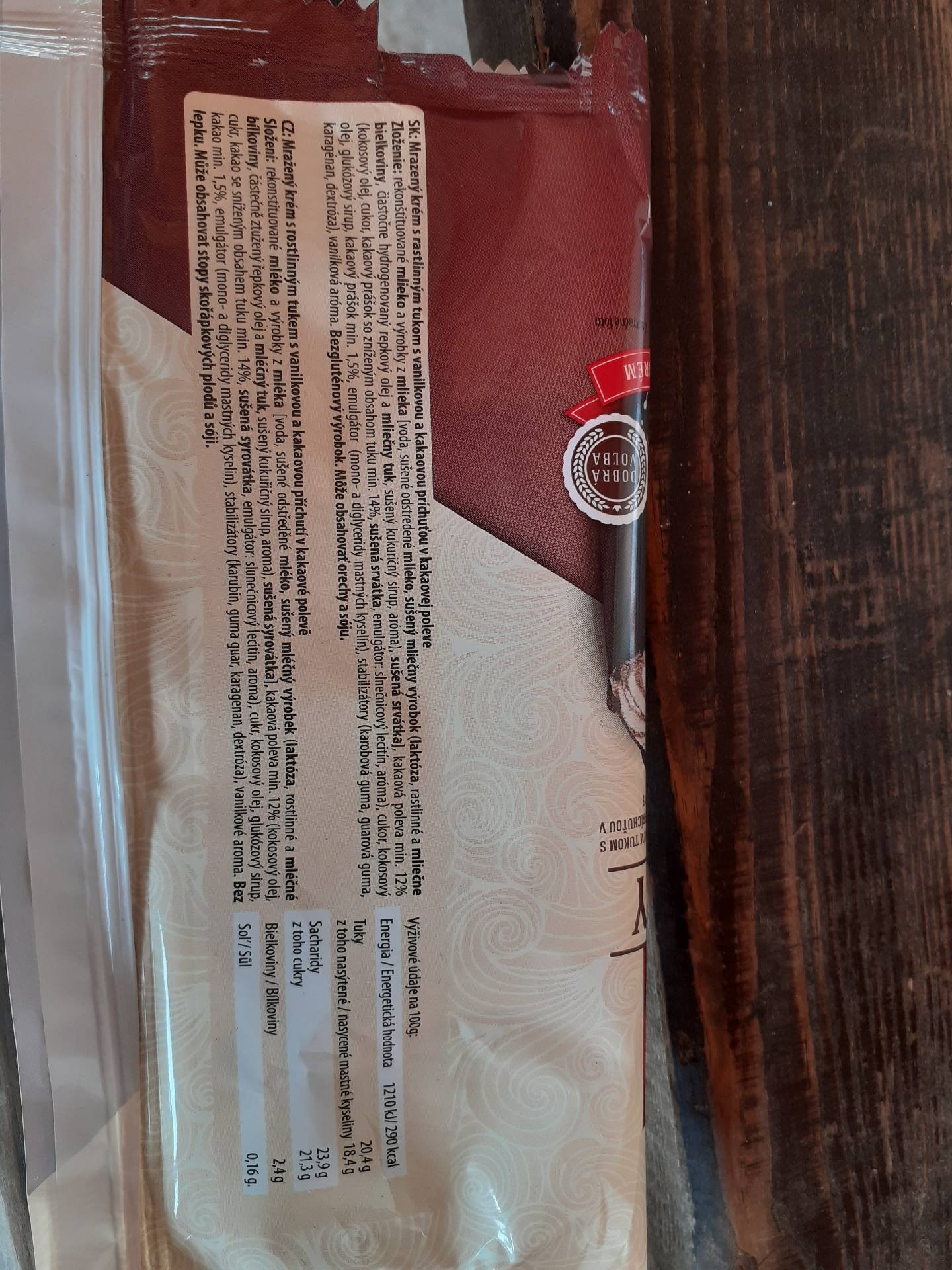 Mražený krém s rostlinným tukem s vanilkovou a kakaovou příchutí v kakaové polevě.