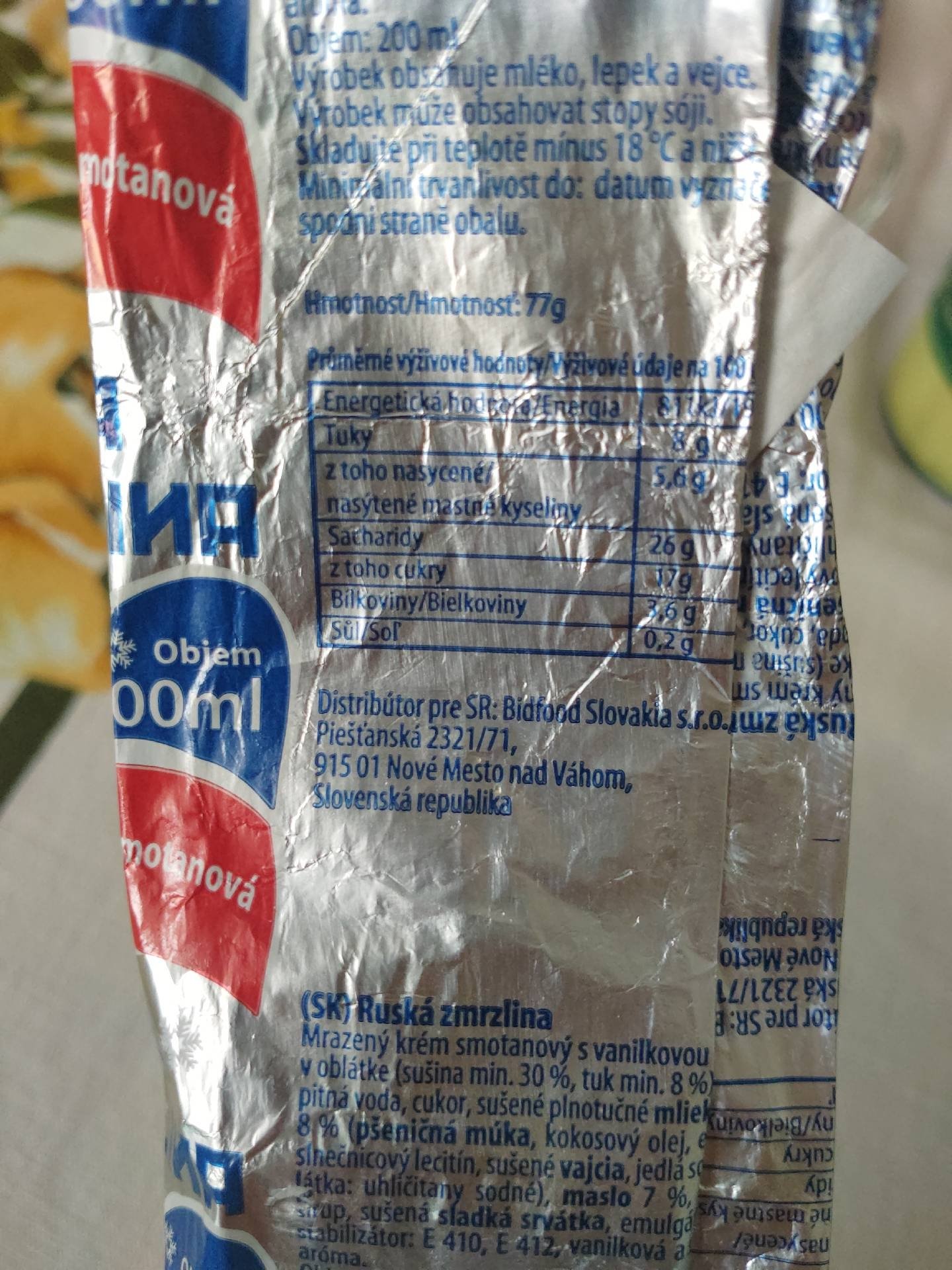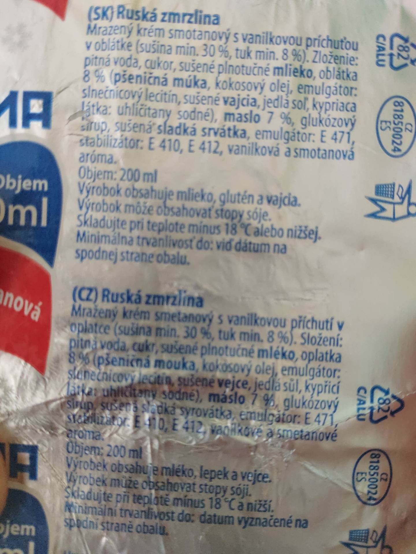 Mražený smetanový krém s vanilkovou příchutí v oplatce. (sušiny min. 30%, tuk min. 8%)