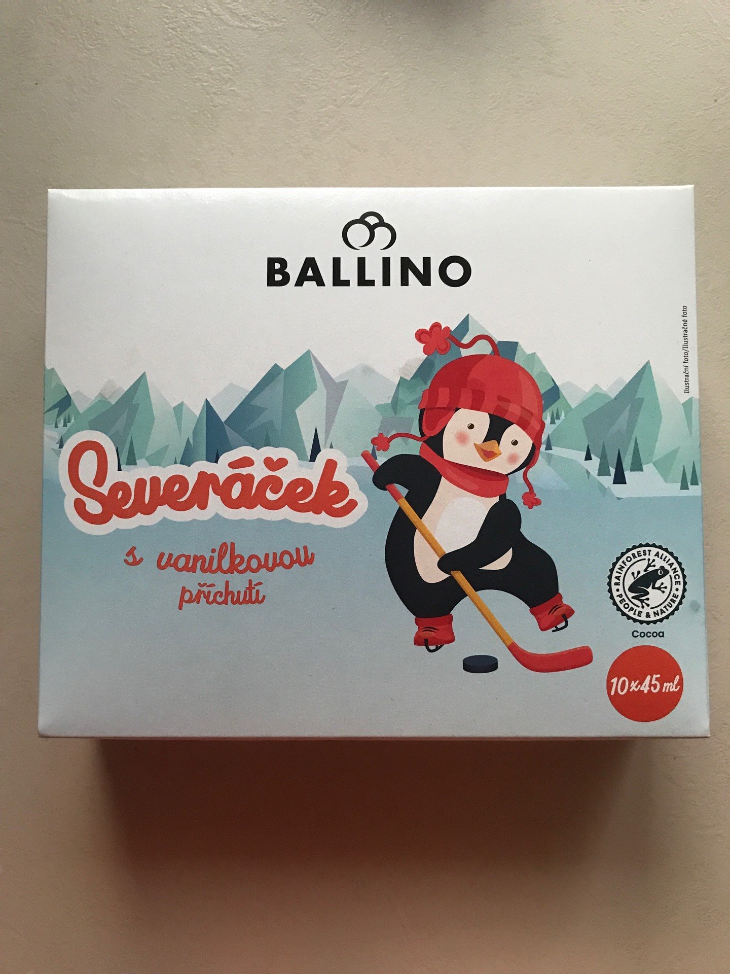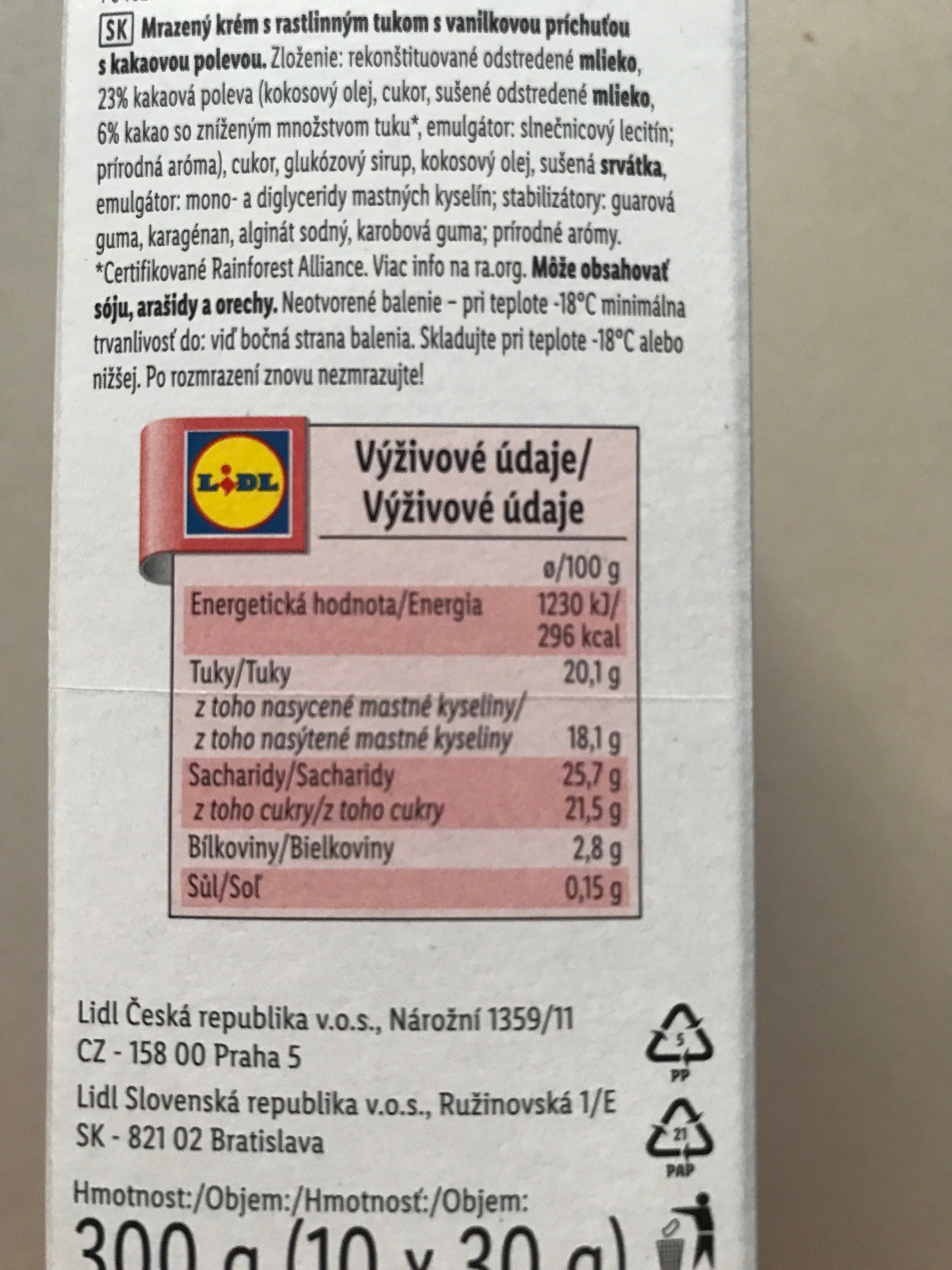 Mražený krém s rostlinným tukem a vanilkovou příchutí s kakaovou polevou.