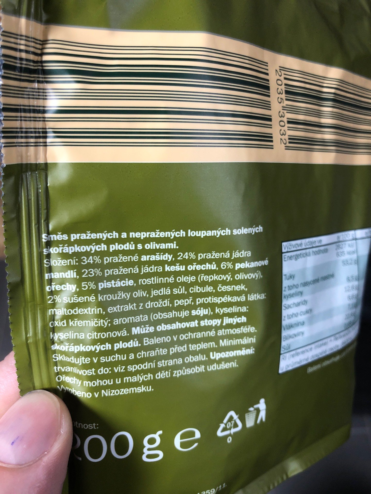 Směs pražených a nepražených lupaných solených skořápkových plodů s olivami.
