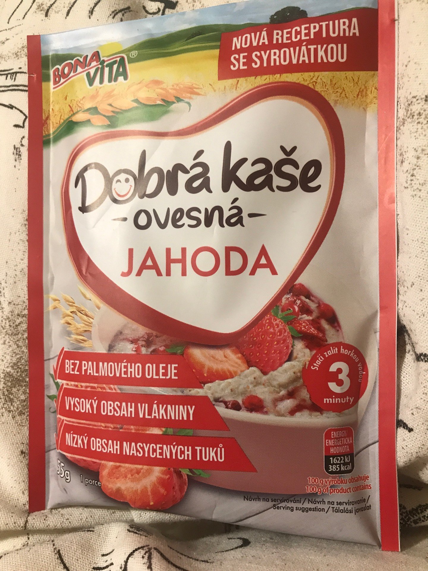 Sypká směs z obilovin pro přípravu ovesné kaše s jahodami zbavenými vody vymrazením, slazená fruktózou.