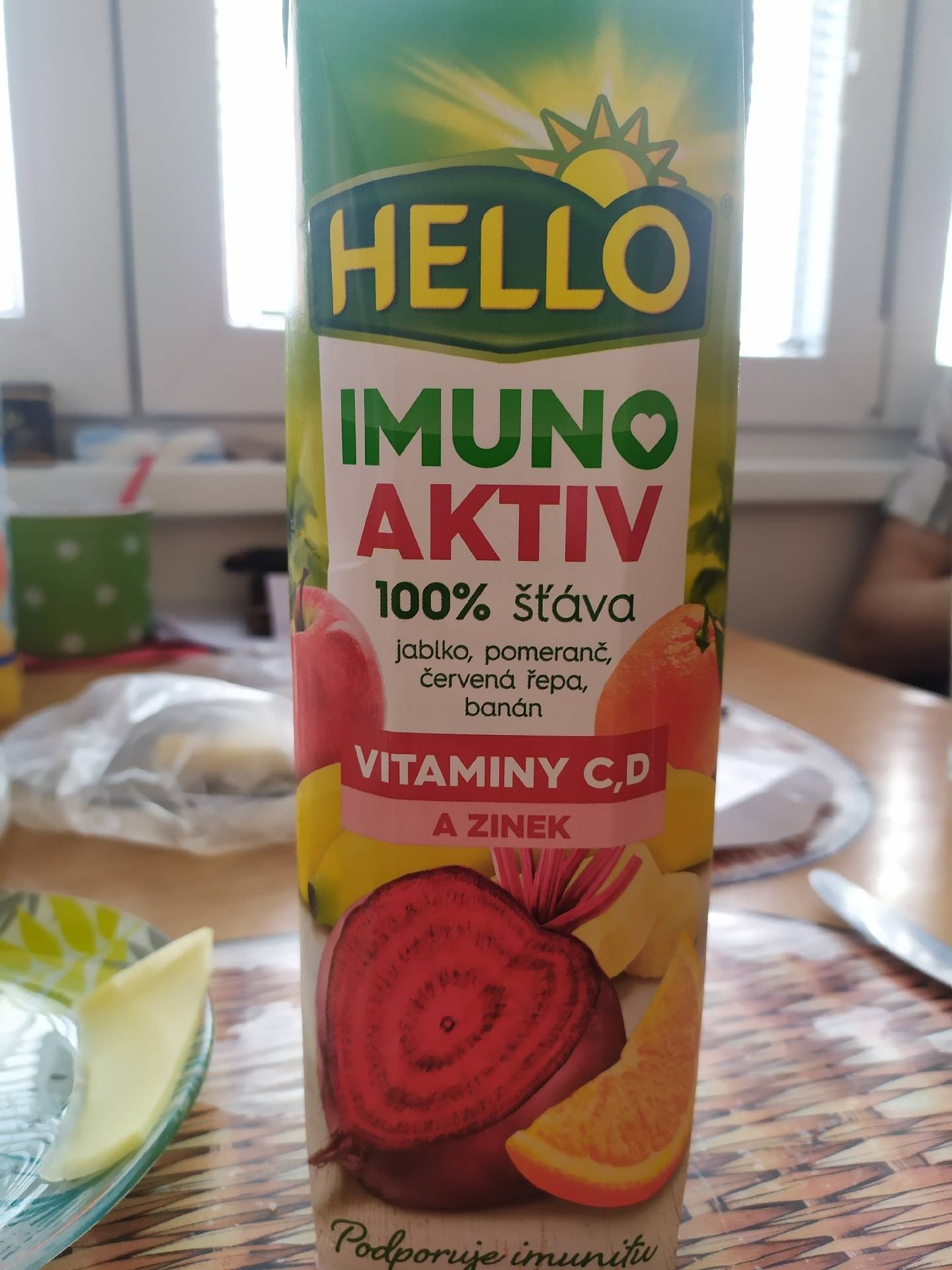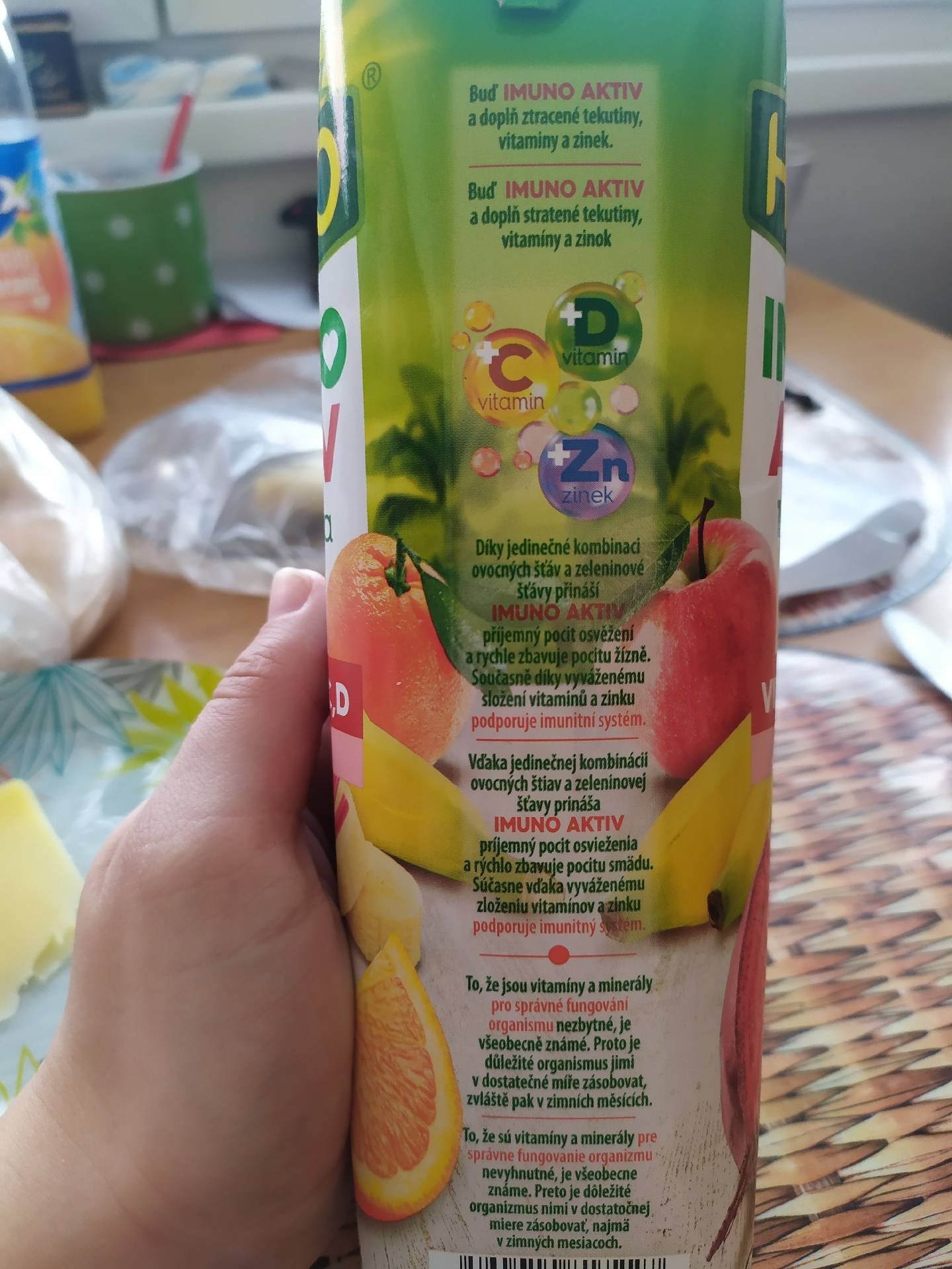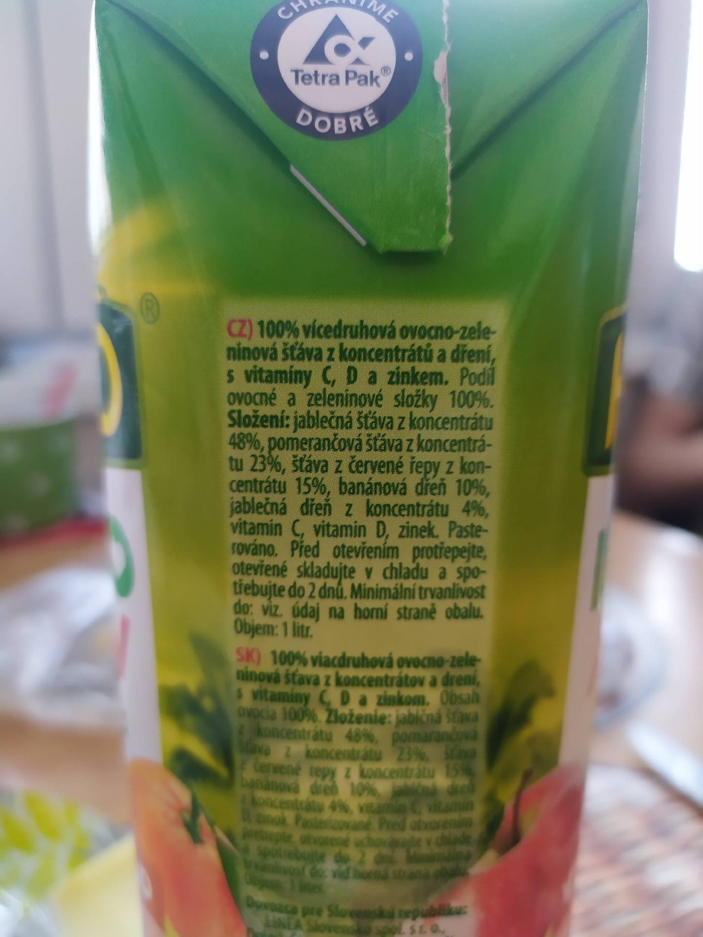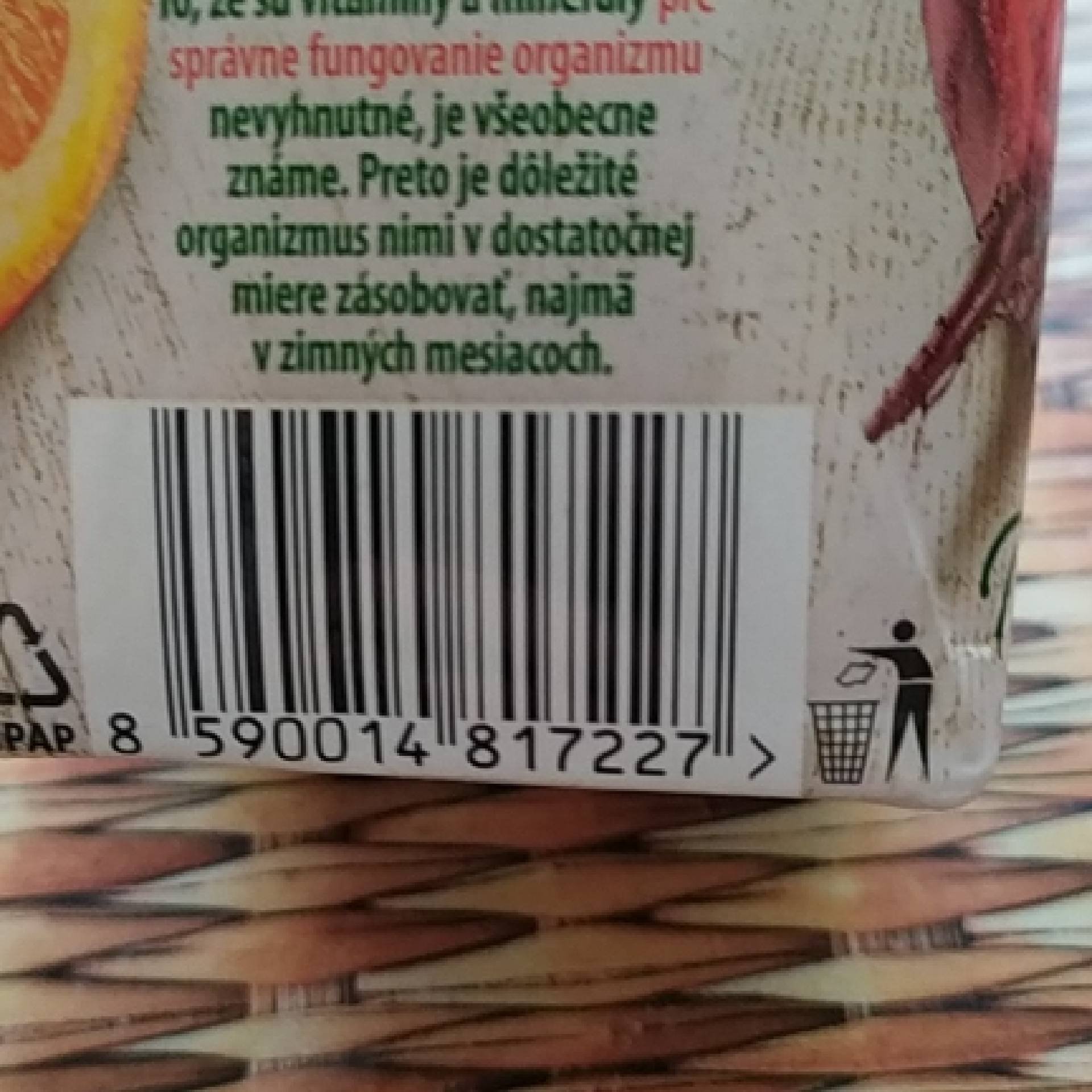 100% vícedruhová ovocno-zeleninová šťáva z koncentrátů a dření, s vitamíny C, D a zinkem.