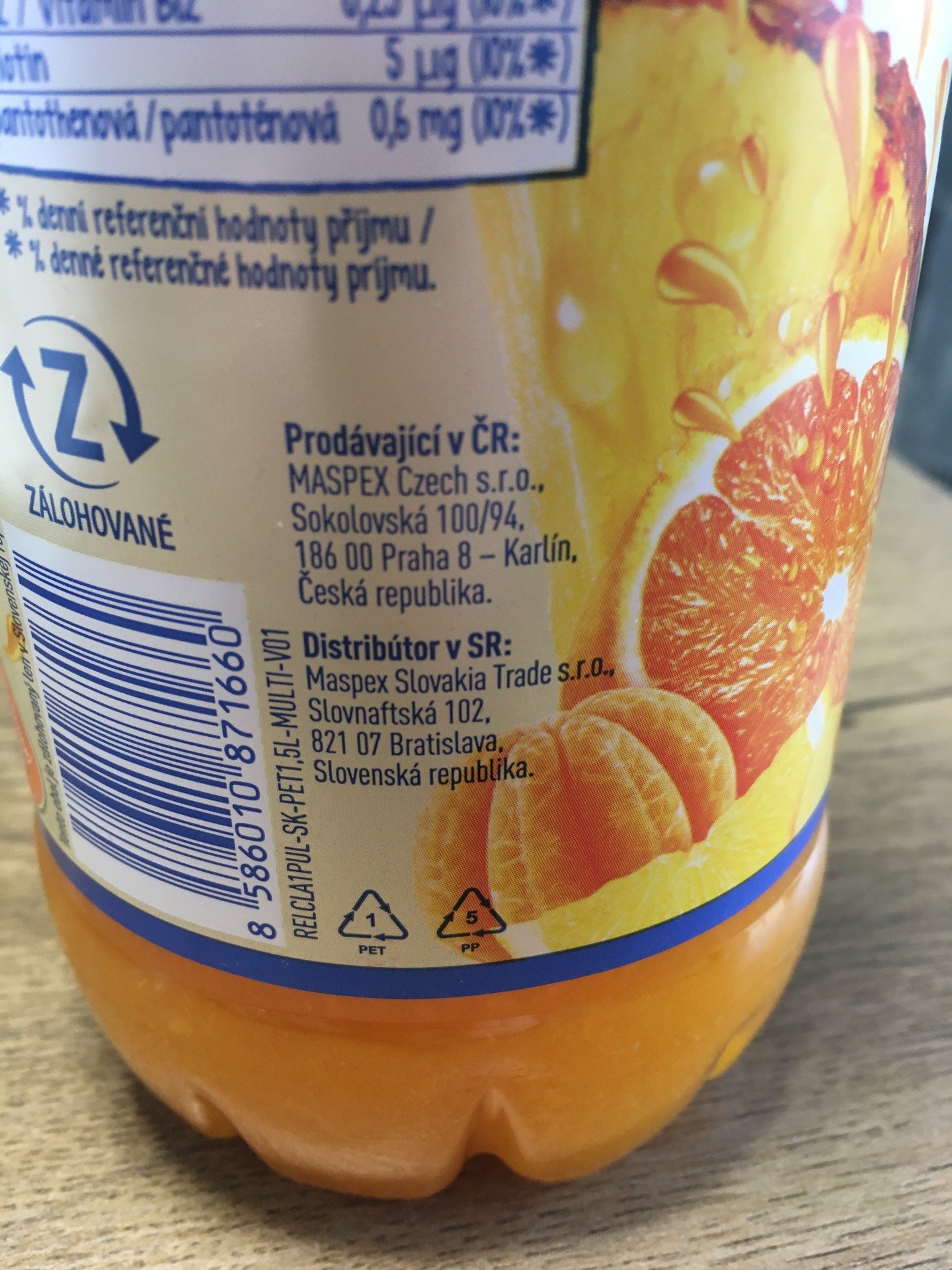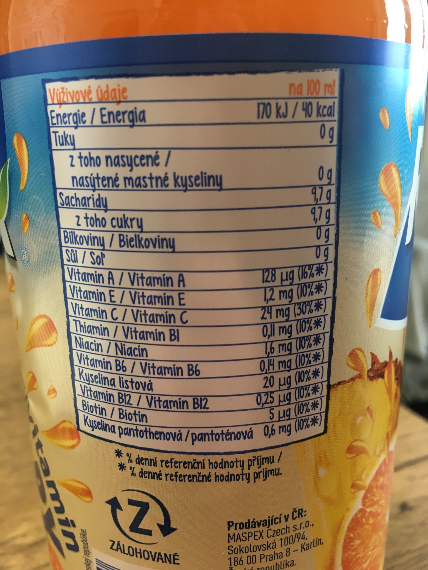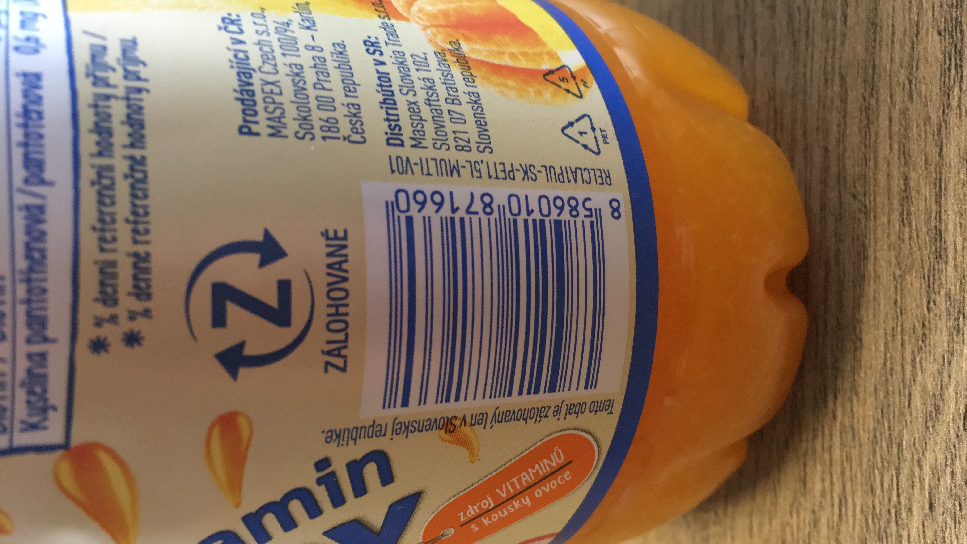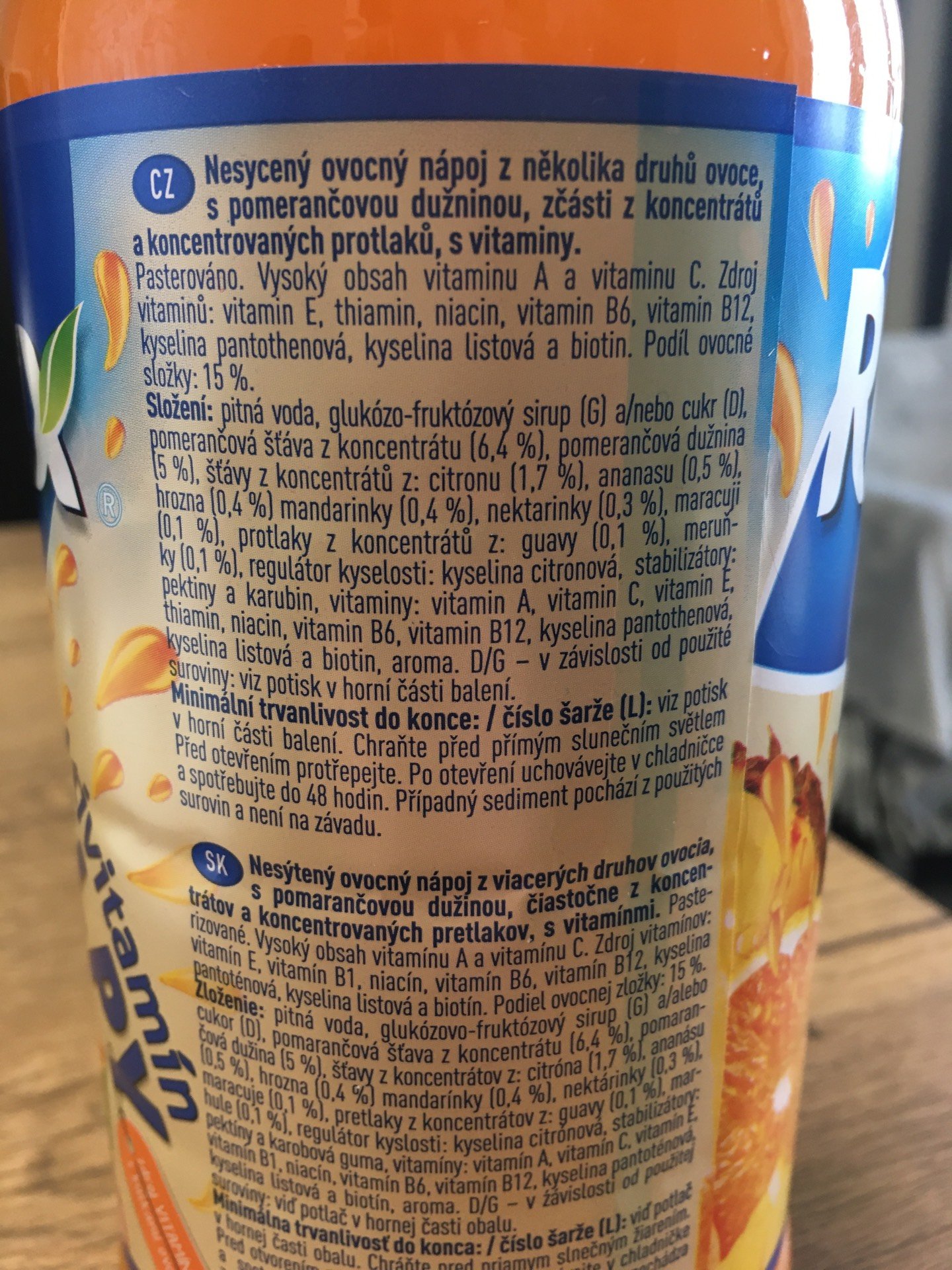 Nesycený ovocný nápoj z několika druhů ovoce, s pomerančovou dužinou, z části z koncentrátů a koncentrovaných protlaků, s vitamíny.