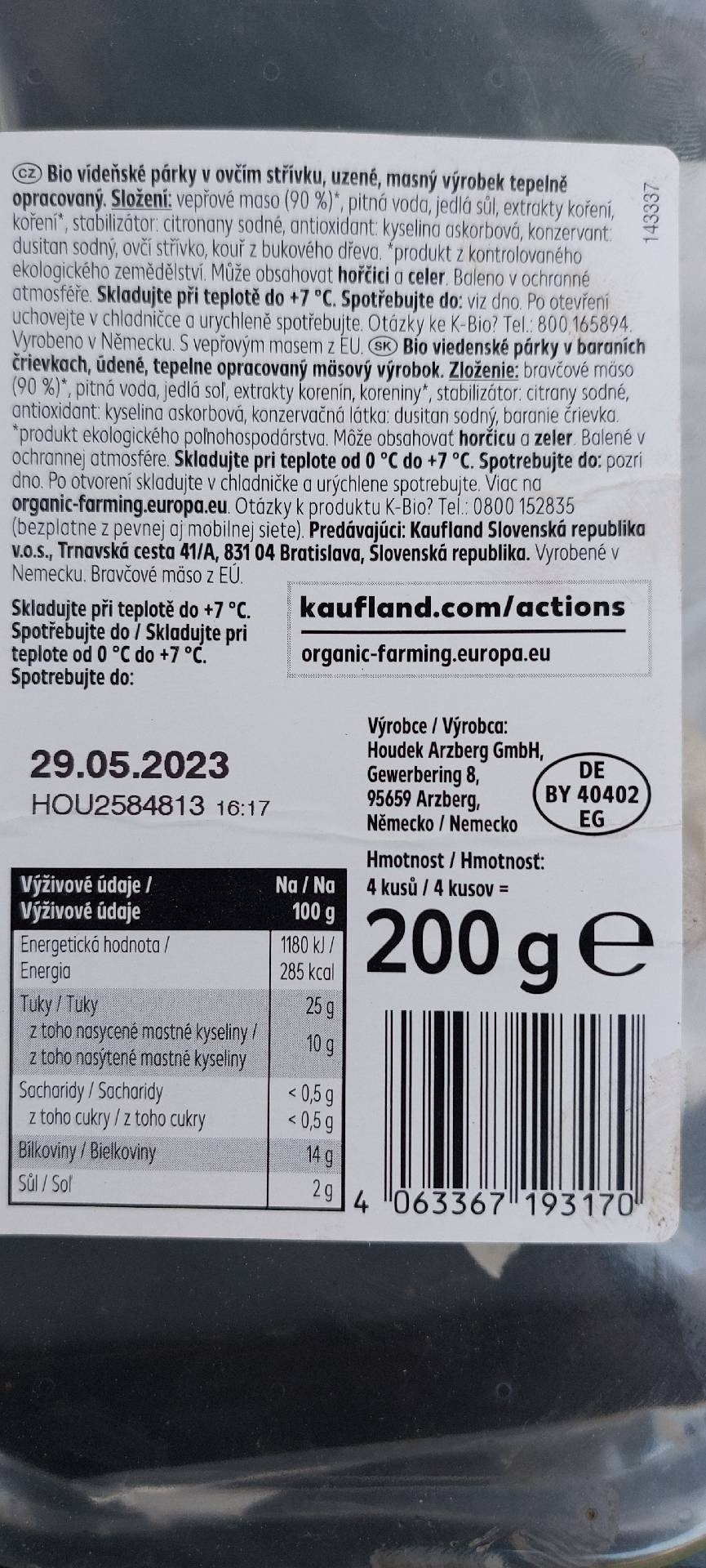 Bio vídeňské párky v ovčím střívku, uzené, masný výrobek tepelně opracovaný.