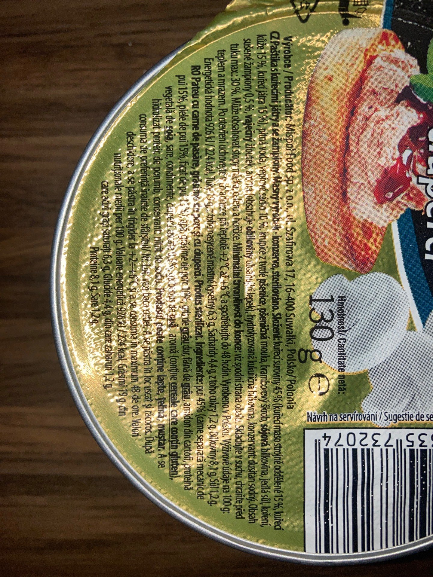 Paštika s kuřecími játry se žampiony. Masný výrobek - konzerva, sterilováno.