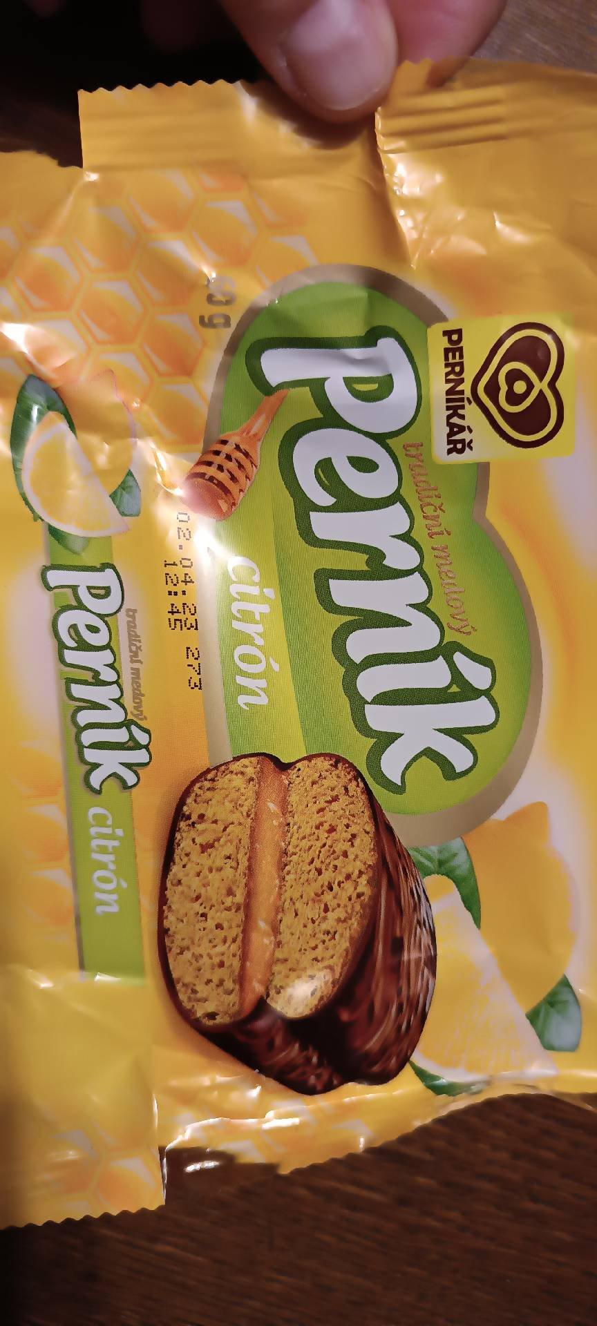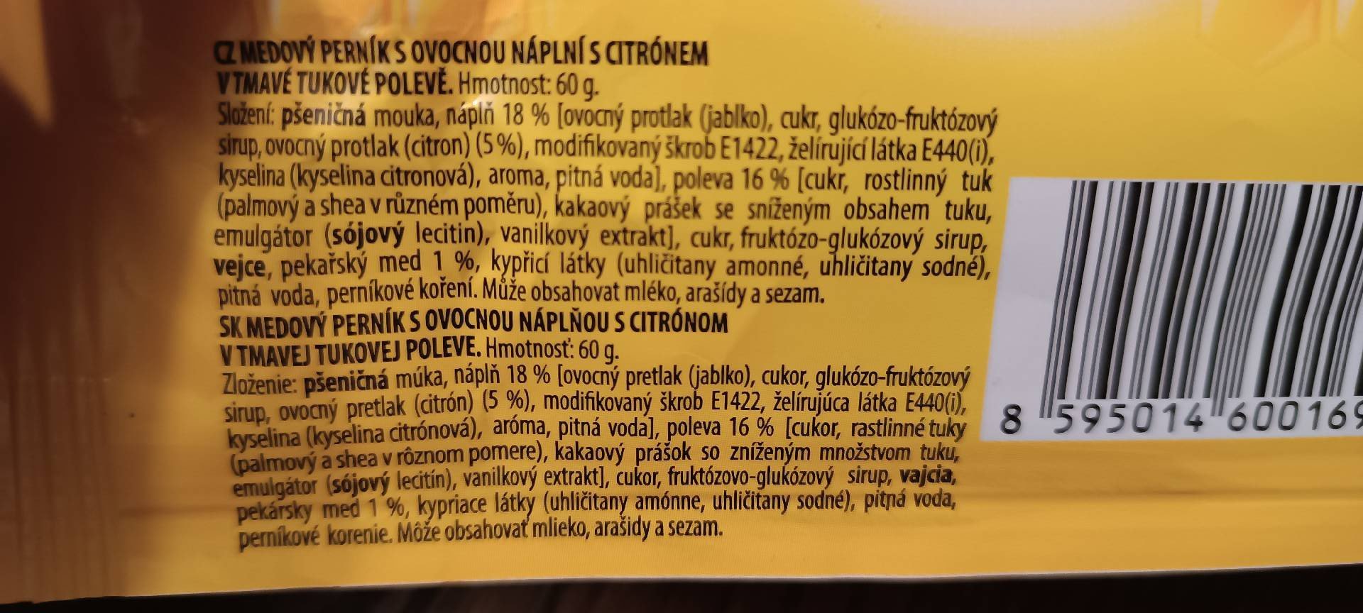 Medový perník s ovocnou náplní s citrónem v tmavé tukové polevě.