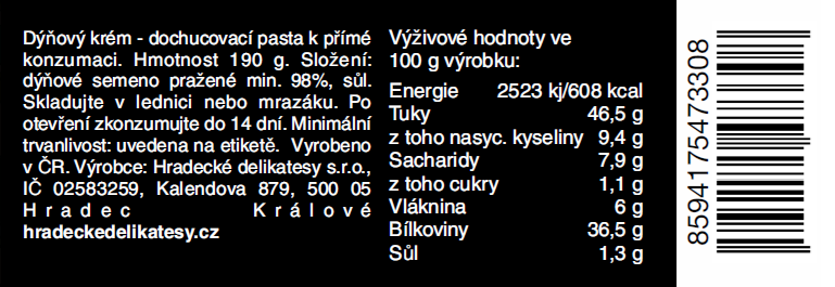 Jemně pražené a solené dýňové semínko rozemleté do podoby pasty nabízí čistou chuťovou esenci dýňového semínka.
