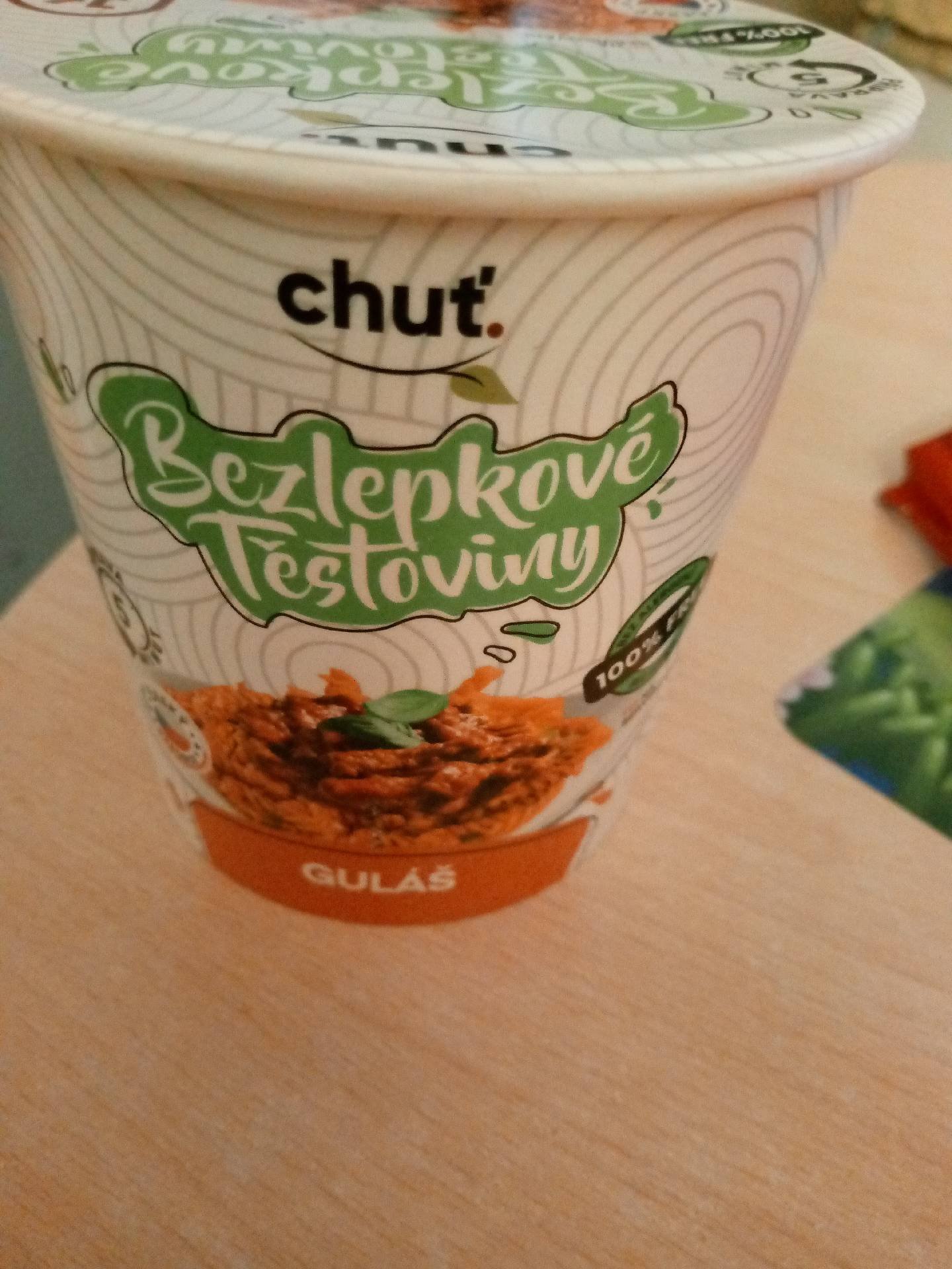 Instantní bezlepkové těstoviny s gulášovou omáčkou. Instantní dehydrovaný výrobek, směs pro přípravu hotového pokrmu.