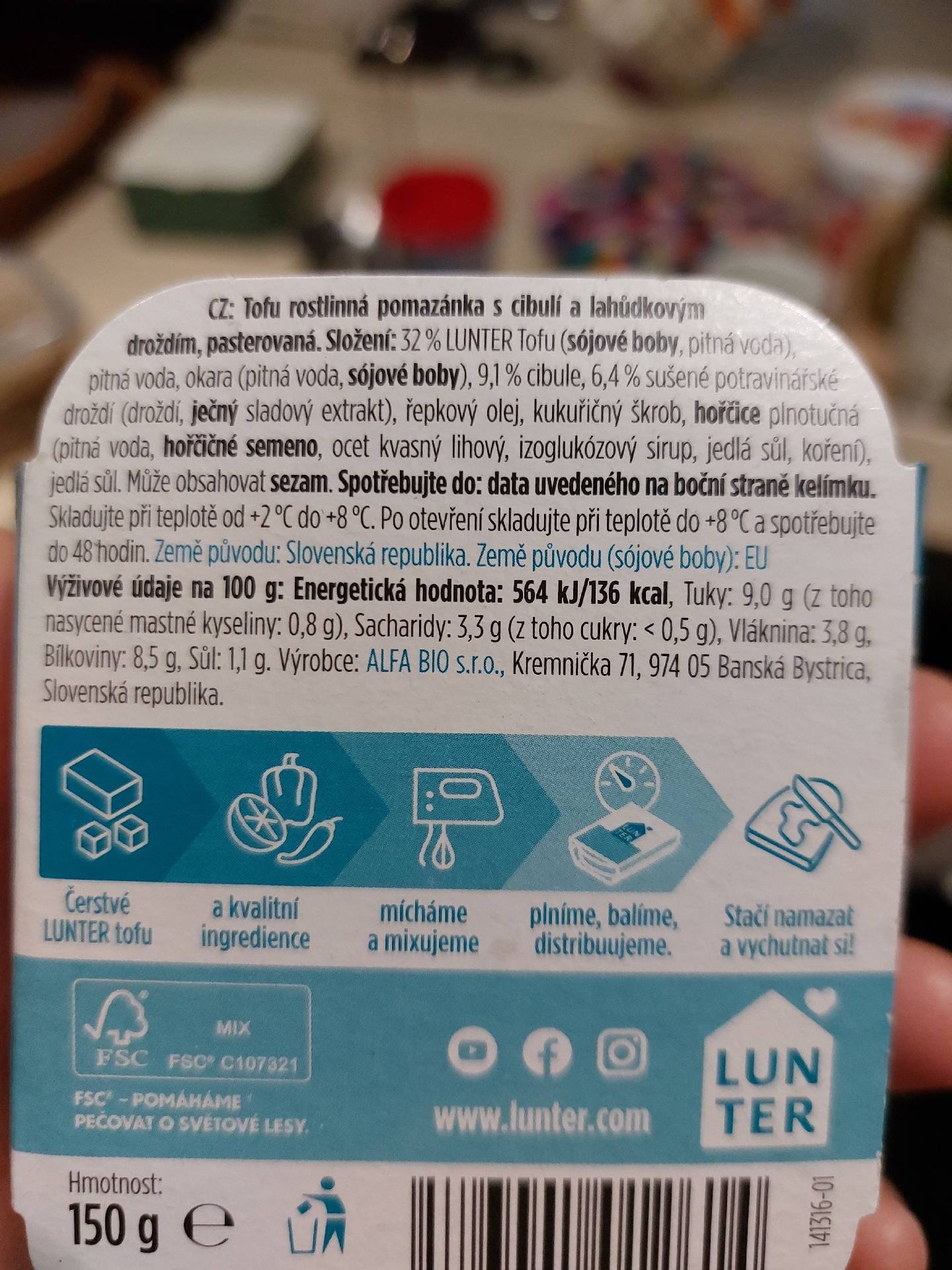 Tofu rostlinná pomazánka s cibulí a lahůdkovým droždím, pasterovaná.