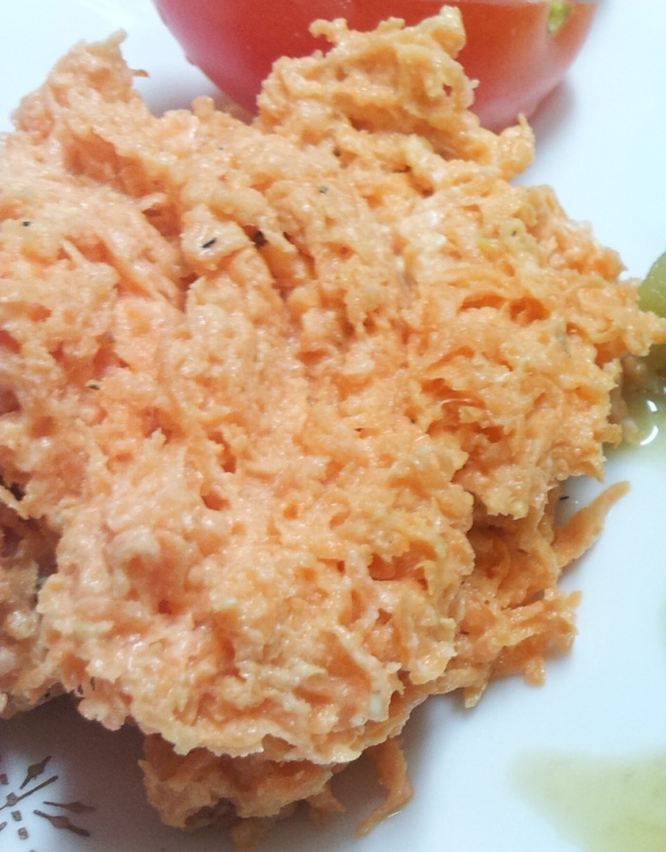 Mrkev nastrouháme na jemno, rovněž česnek a vmícháme trochu sýra. Dochutíme špetkou soli, popřípadě i pepřem (nemusí být).