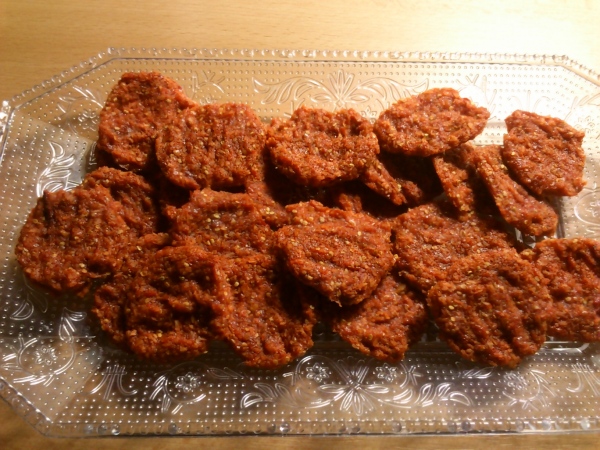 Kustovnici namočíme na chvíli do vody, aby plody nabobtnaly. Umixujeme zvlášť lněná semínka, pak kustovnici a v míse smícháme s kokosem a medem. Vytvoříme hutnější těsto, z kterého na pečící papír tvoříme pomocí lžičky hrudky a vidličkou zplácneme na placičky. Necháme sušit v sušičce do 40°C nebo na topení za použití dřevěné podložky do křupava.