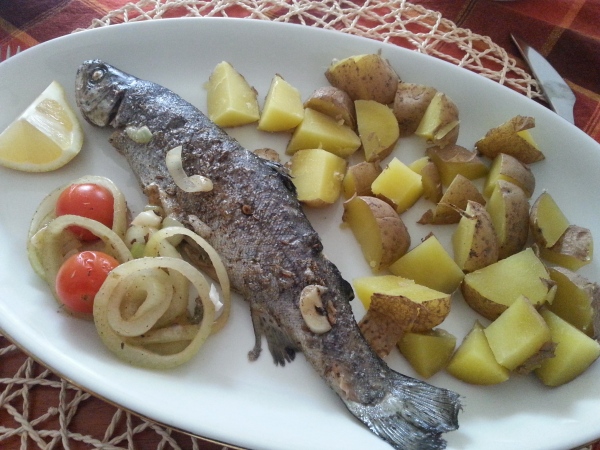 Pstruha vložíme na pánev s vodou a citrónem. Při pomalém varu jej povaříme, až se voda vyvaří, přidáme cibulku a česnek a trochu jej orestujeme. Nové brambory si povaříme ve slupce a chvíli počkáme, až vychladnou. Kvůli škrobům je dobré jíst brambory za studena, nikoliv ihned po uvaření. K rybě přidáme rajče a kousek citrónu.