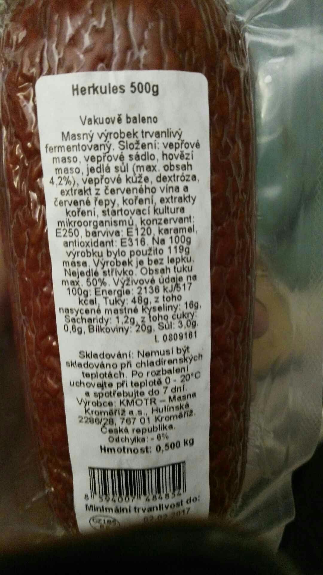 Masný výrobek trvanlivý fermentovaný. Na 100 g výrobku bylo použito 119 g masa.