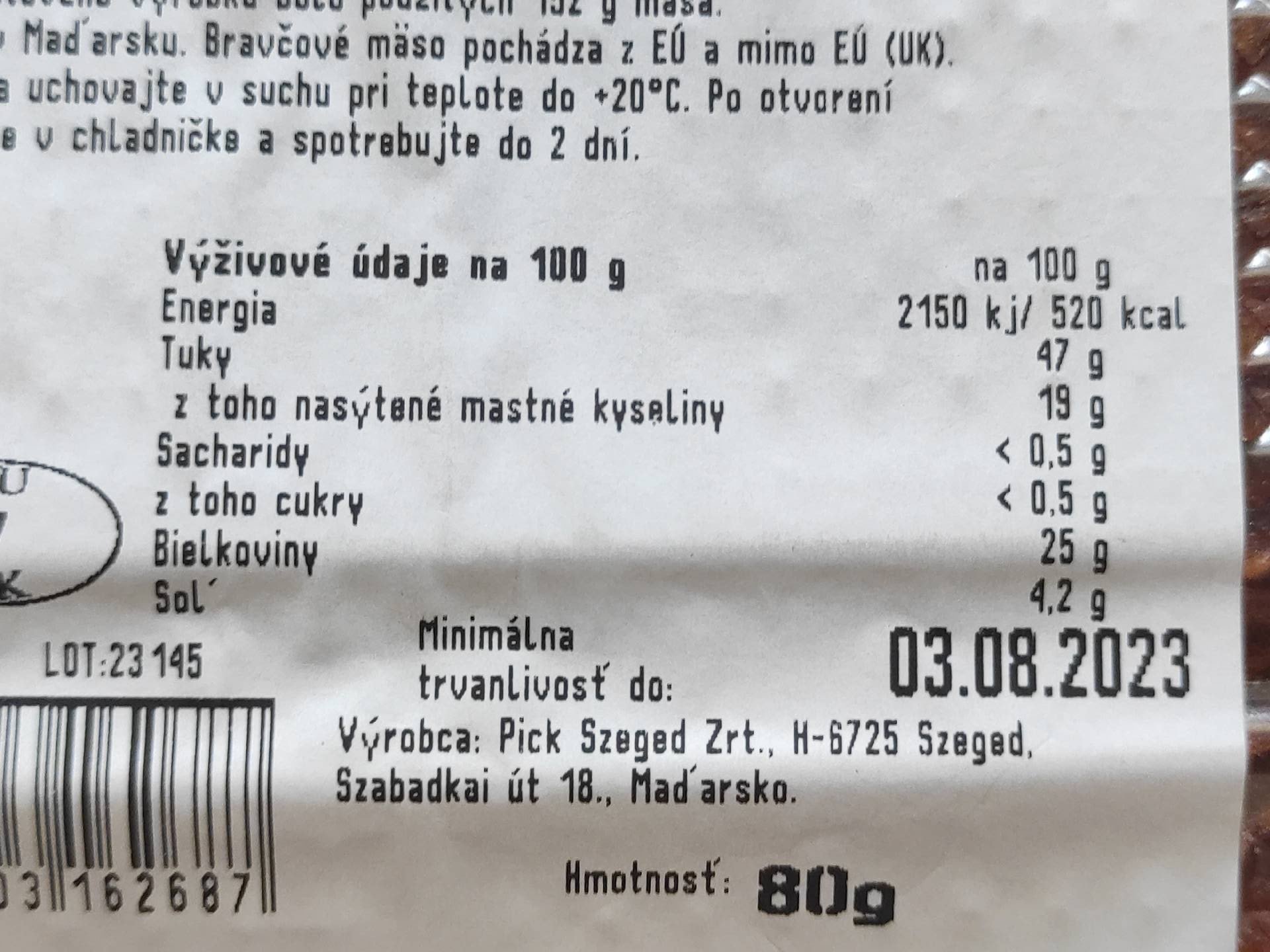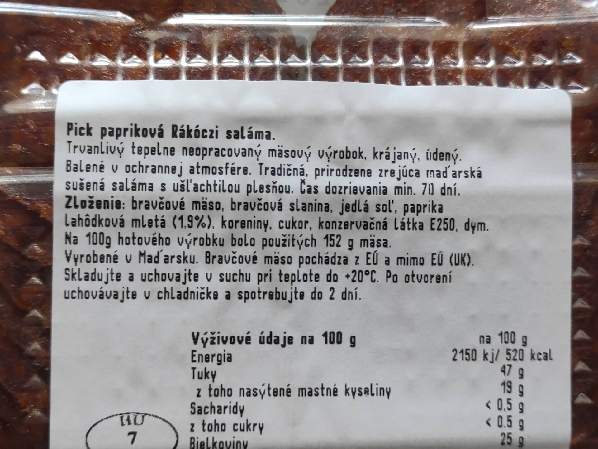 | Obsah přidaných dusitanů | není znám jiný než zákonný podíl | 0 |