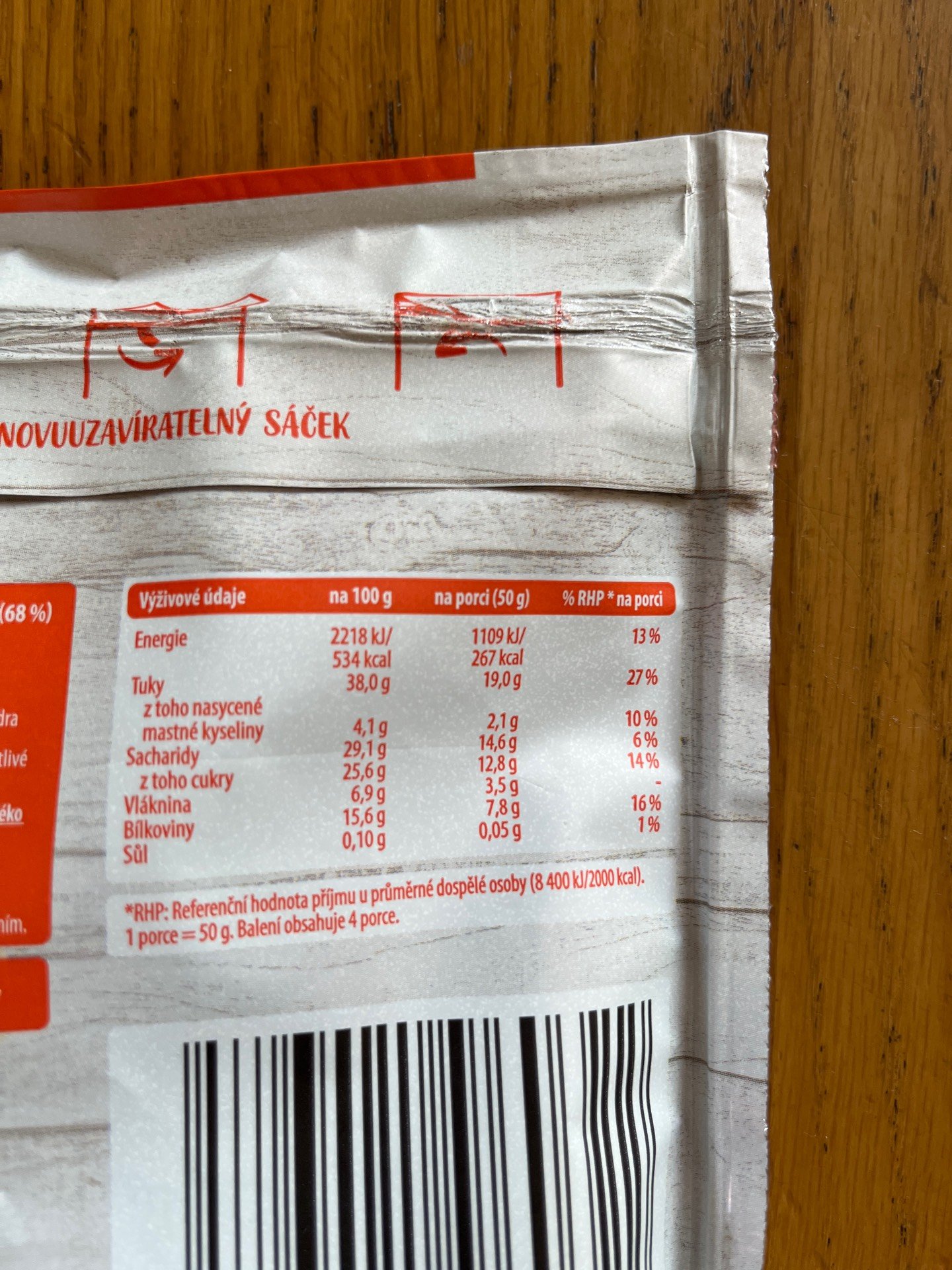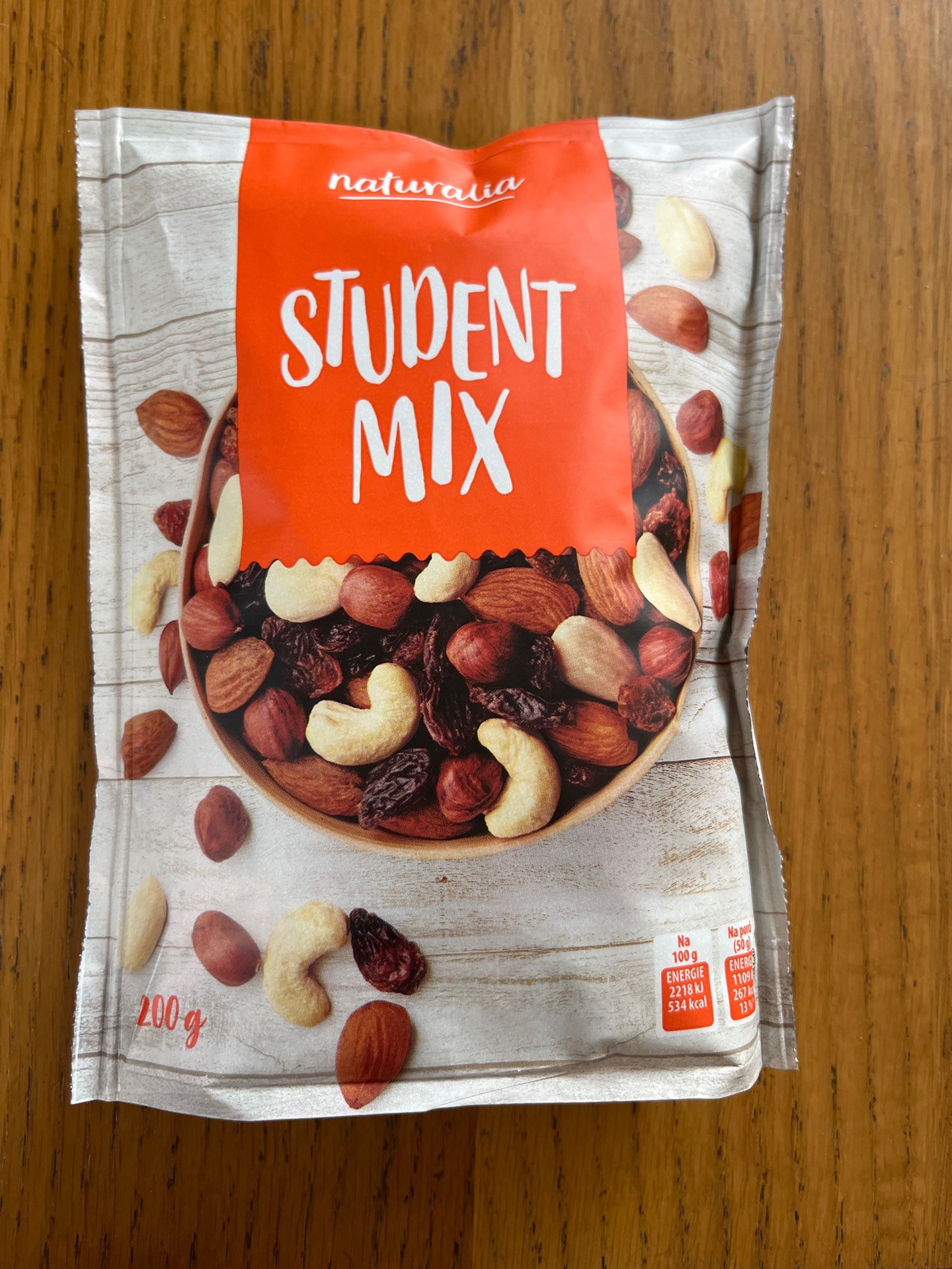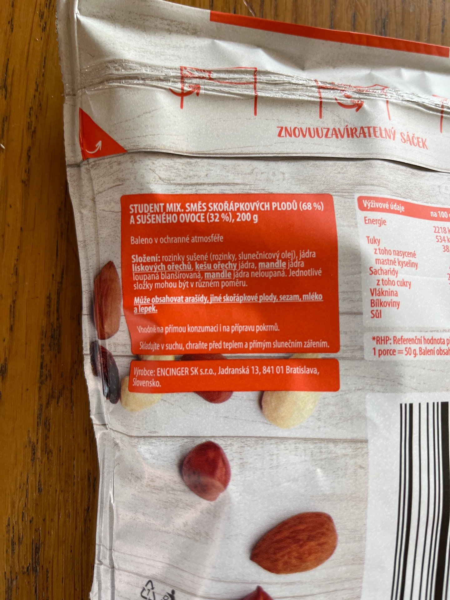 Směs skořápkových plodů 68% a sušeného ovoce 32%.