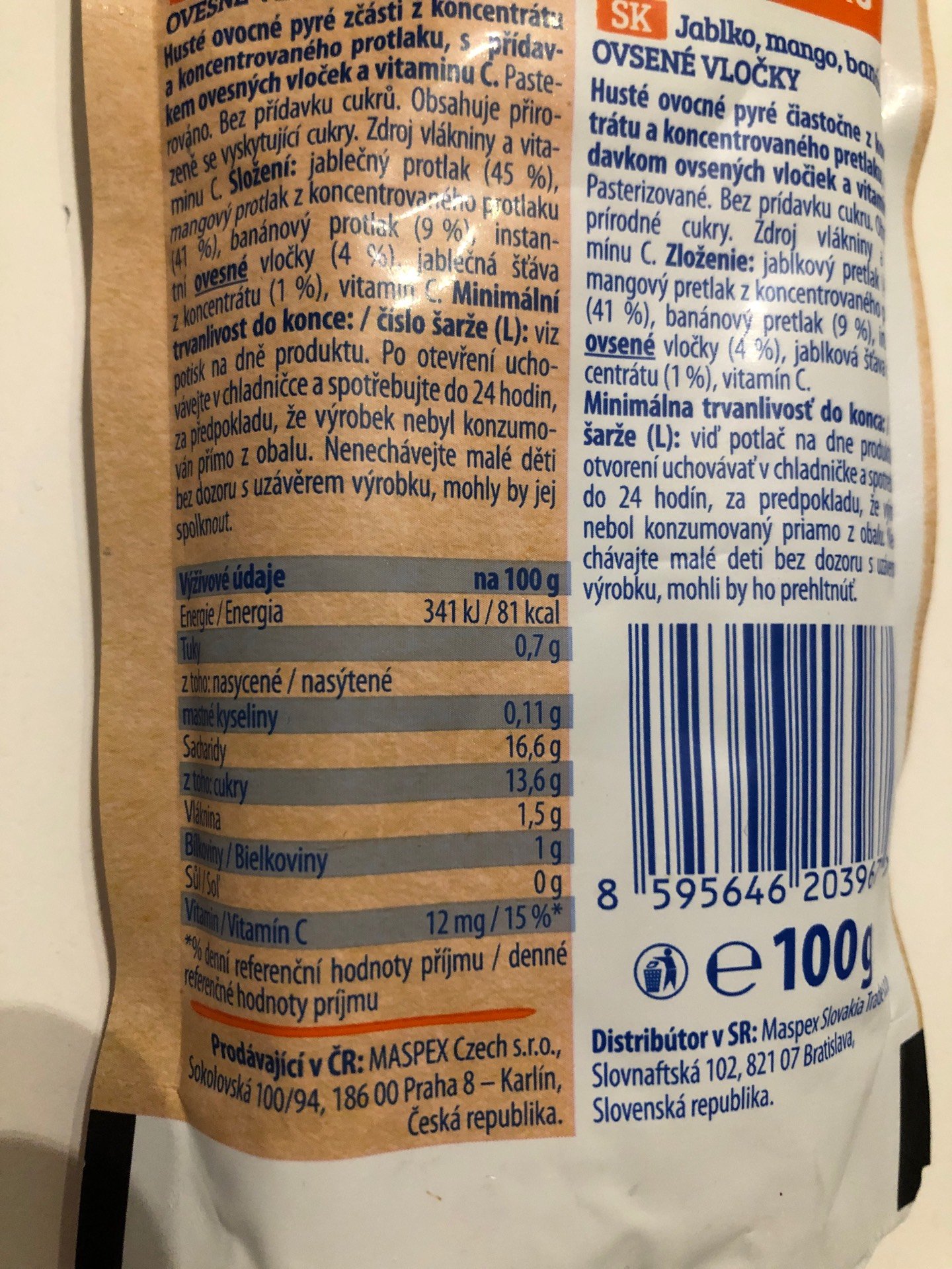 Husté ovocné pyré zčásti z koncentrátu a koncentrovaného protlaku, s přídavkem ovesných vloček a vitamínu C.