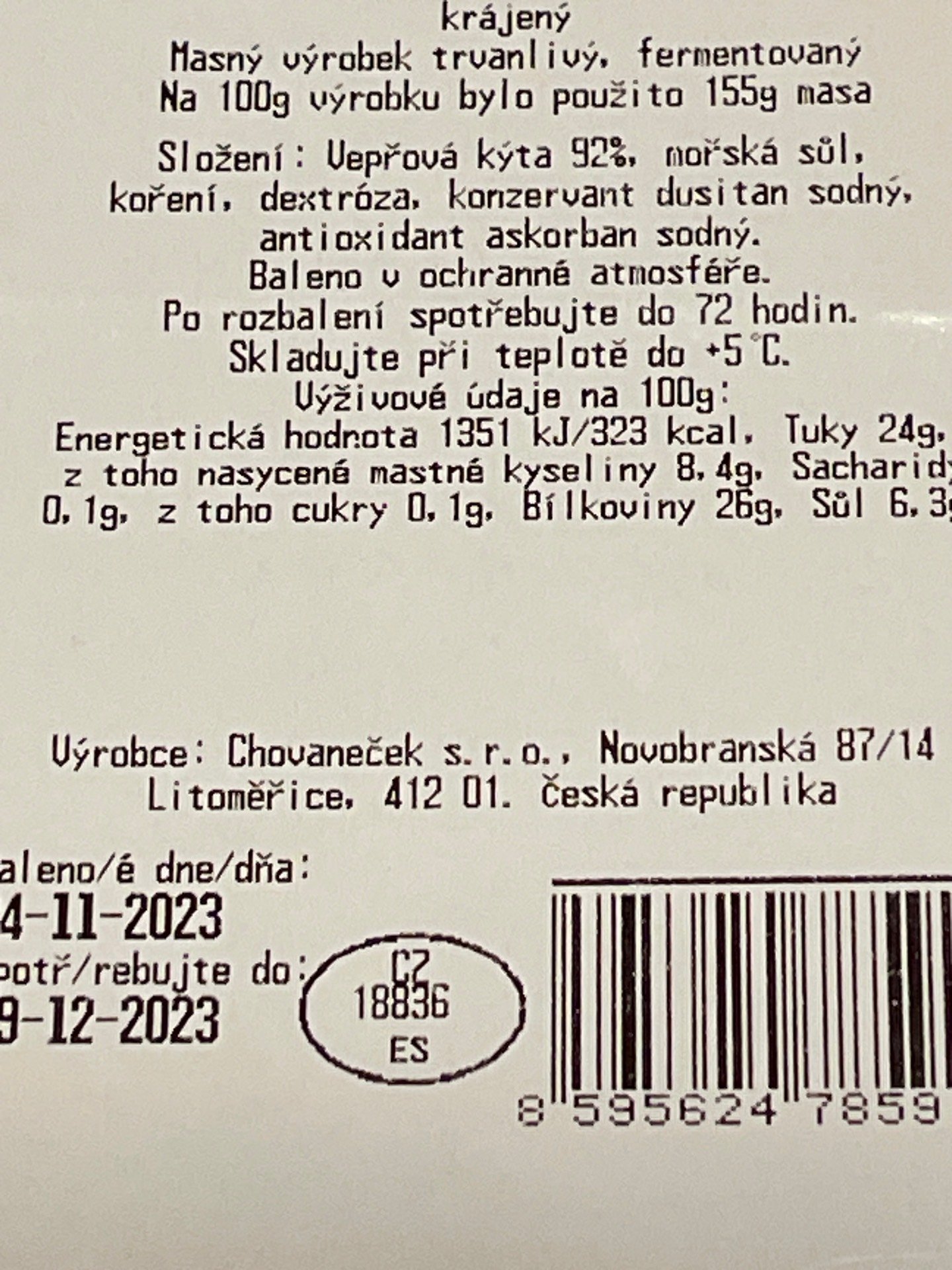 | Obsah přidaných dusitanů | není znám jiný než zákonný podíl | 0 |