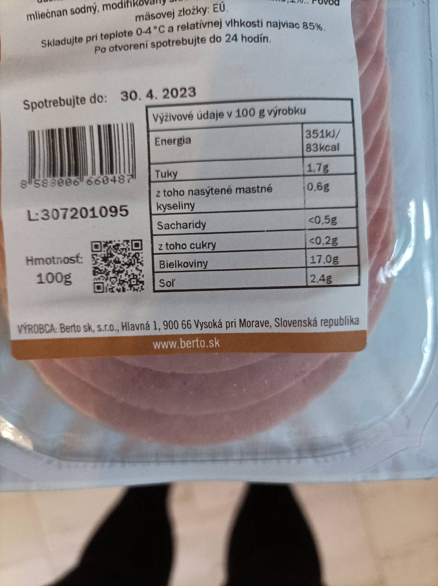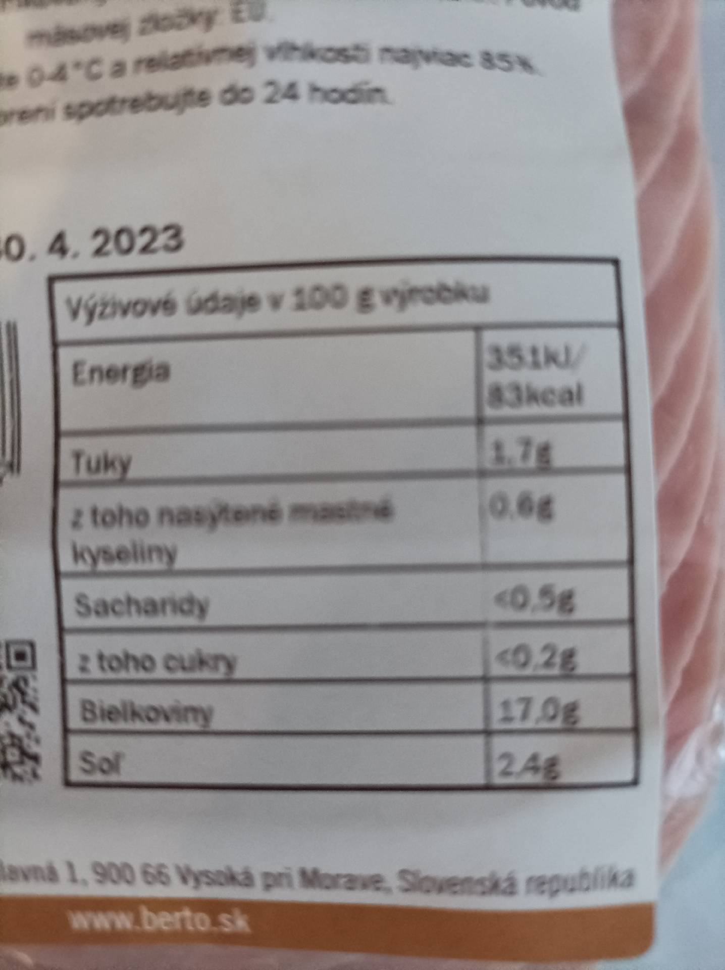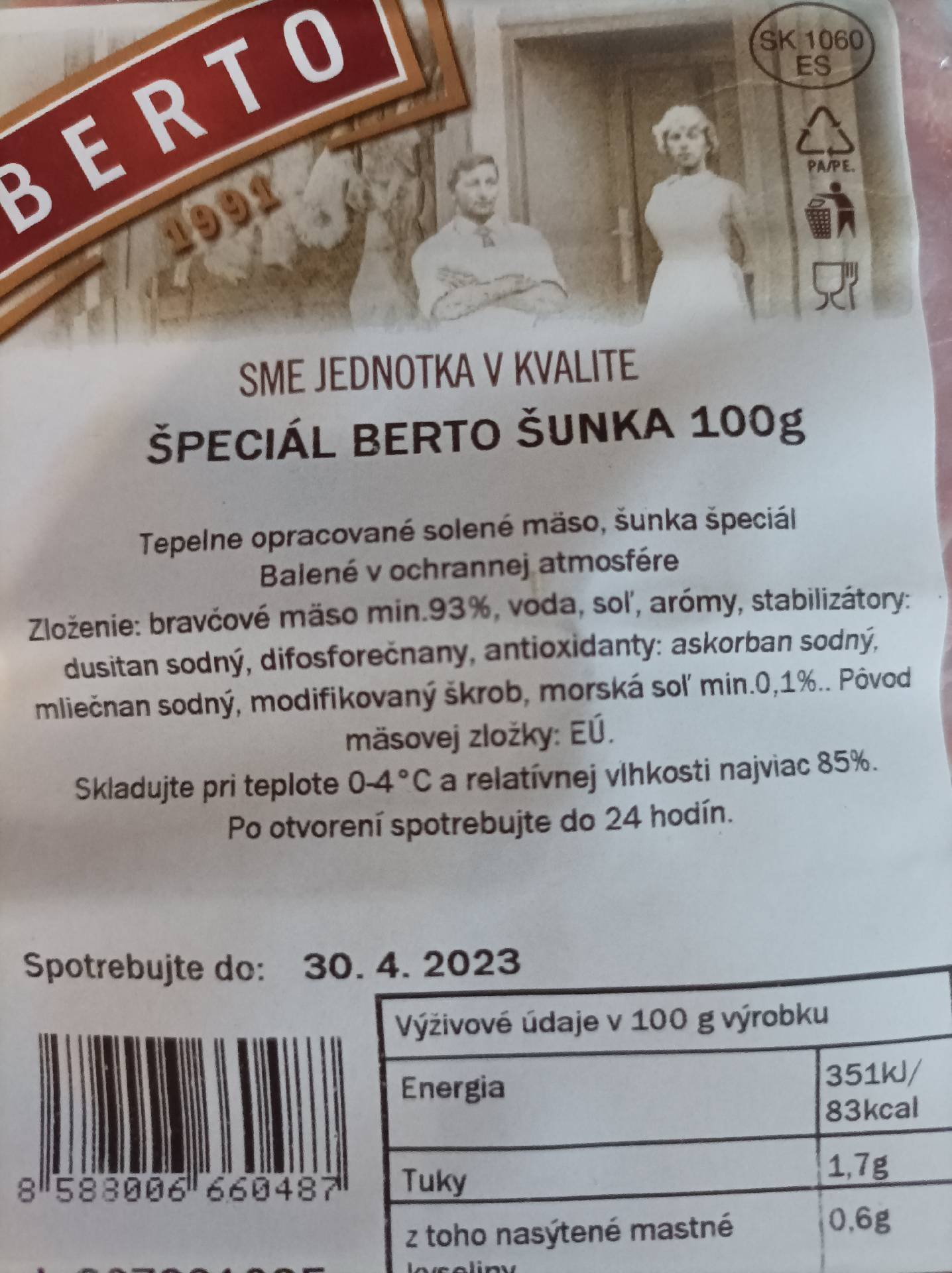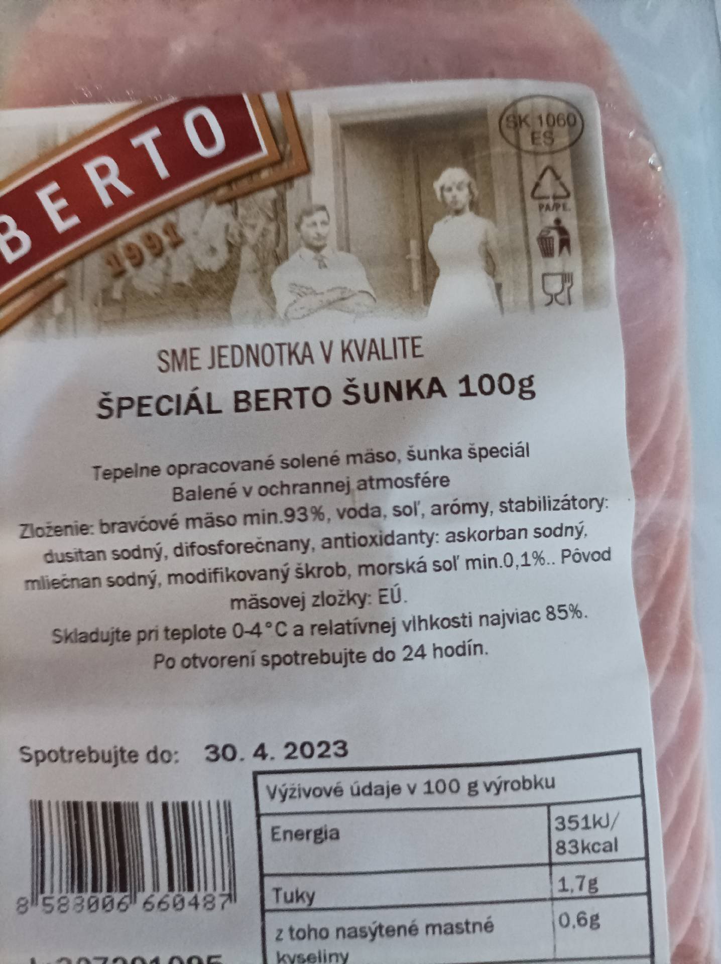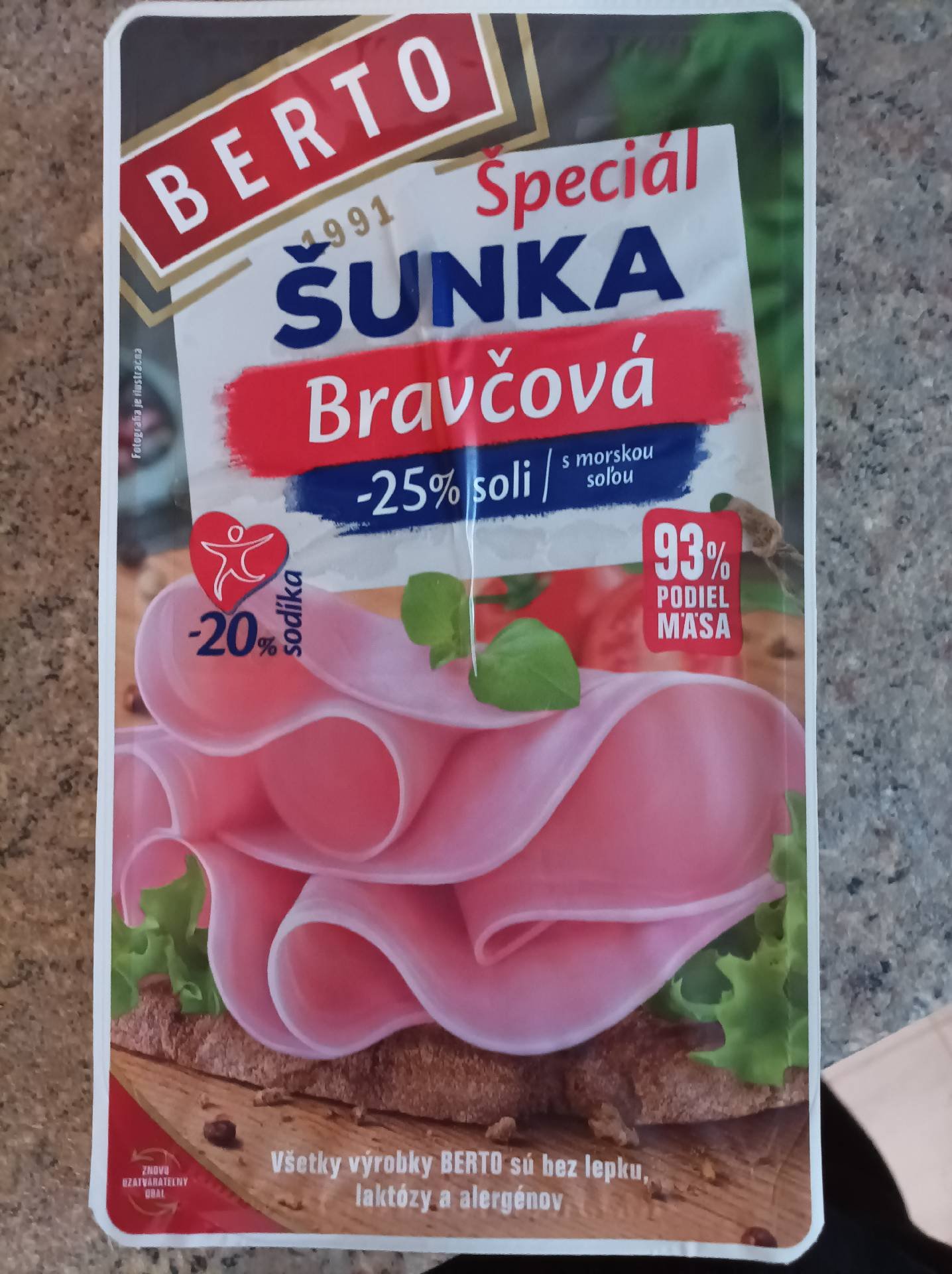 Speciál BERTO šunka. Tepelně opracované solené maso šunka speciál. Balené v ochranné atmosféře. Bez lepku. Bez laktózy. Bez alergenů.