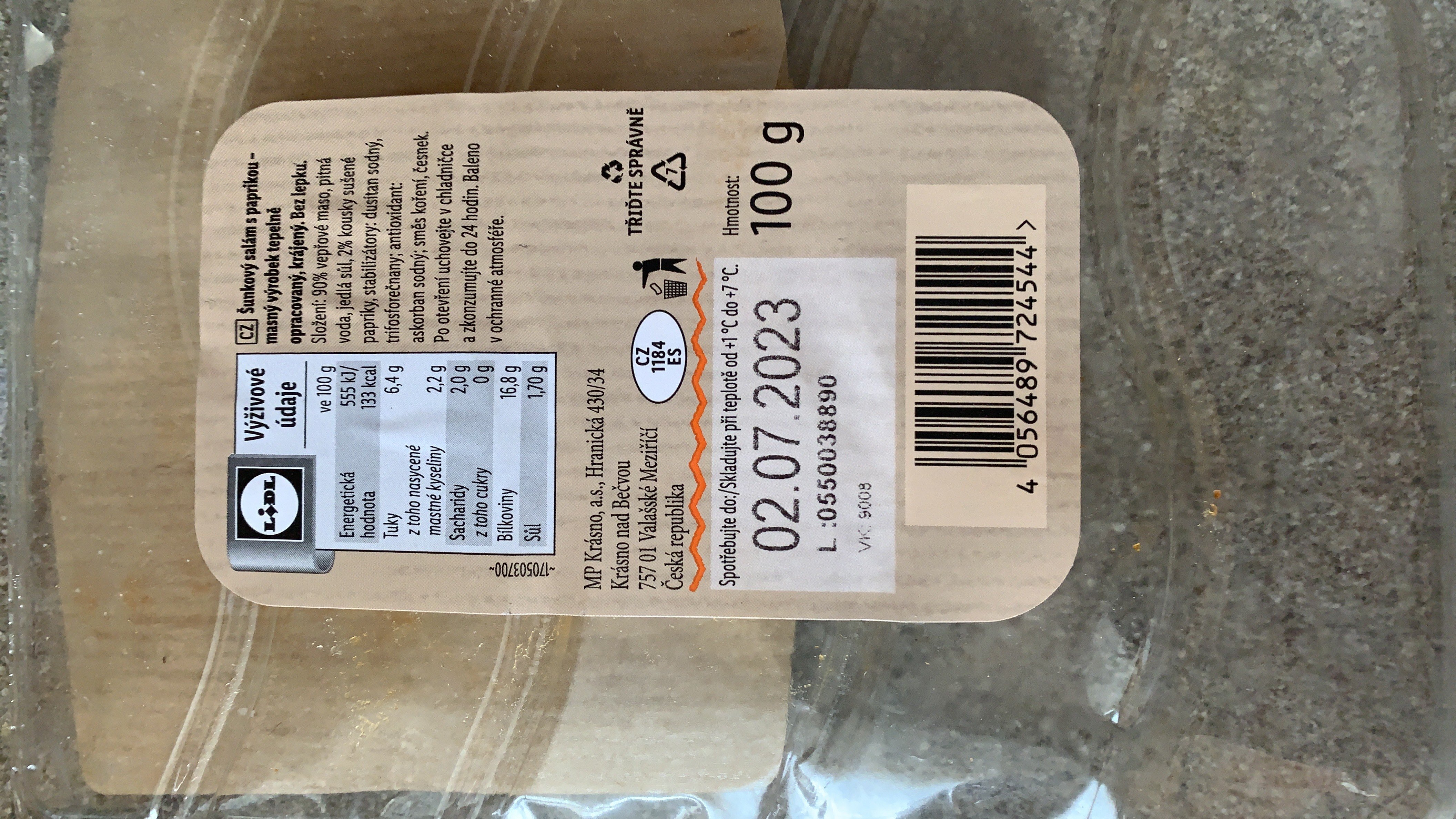 Šunkový salám s paprikou - masný výrobek tepelně opracovaný, krájený.