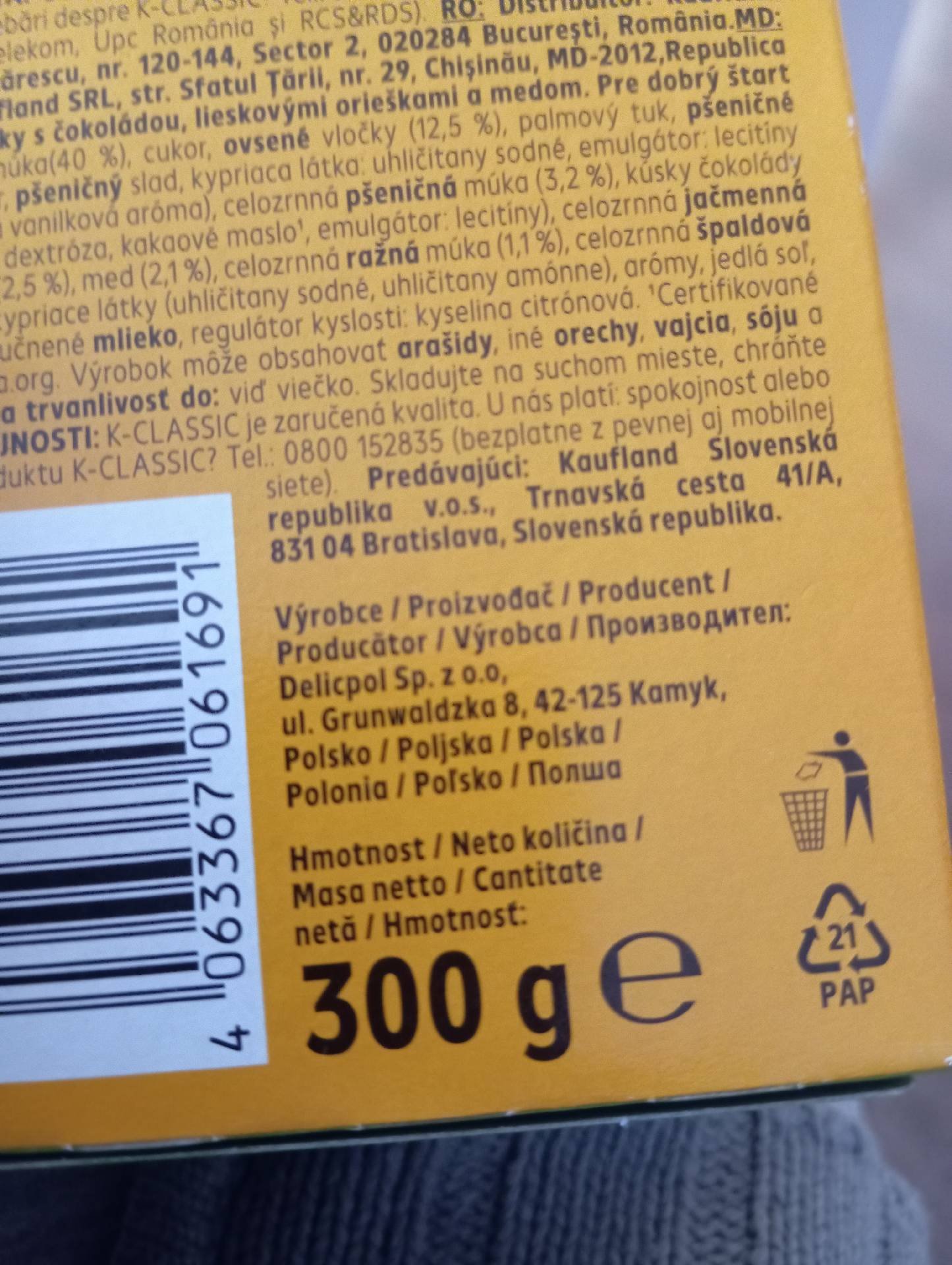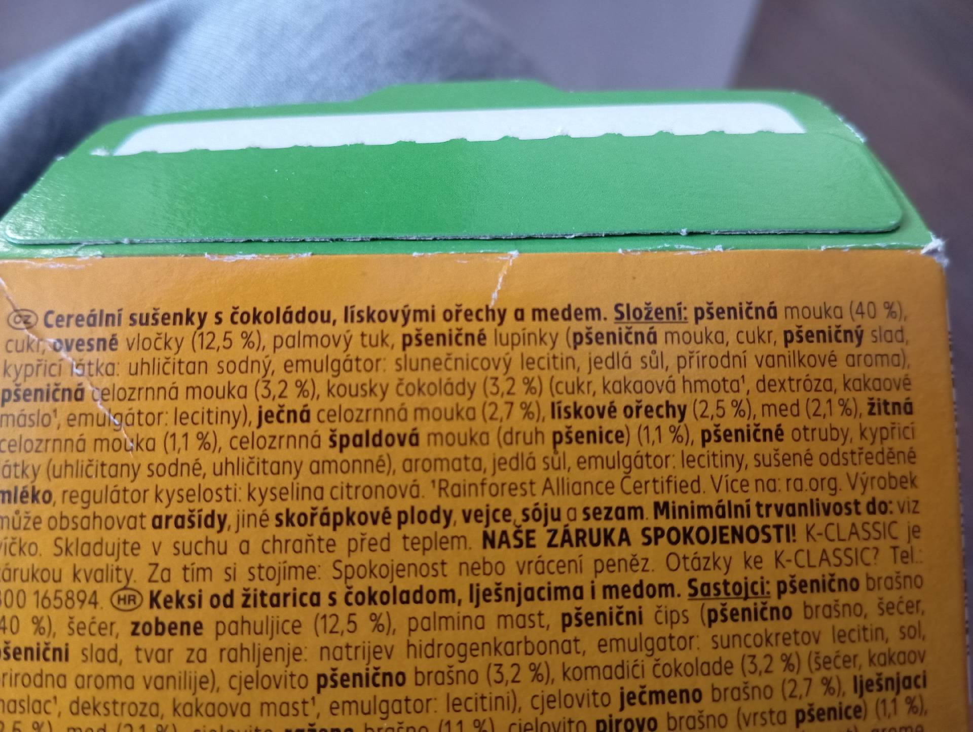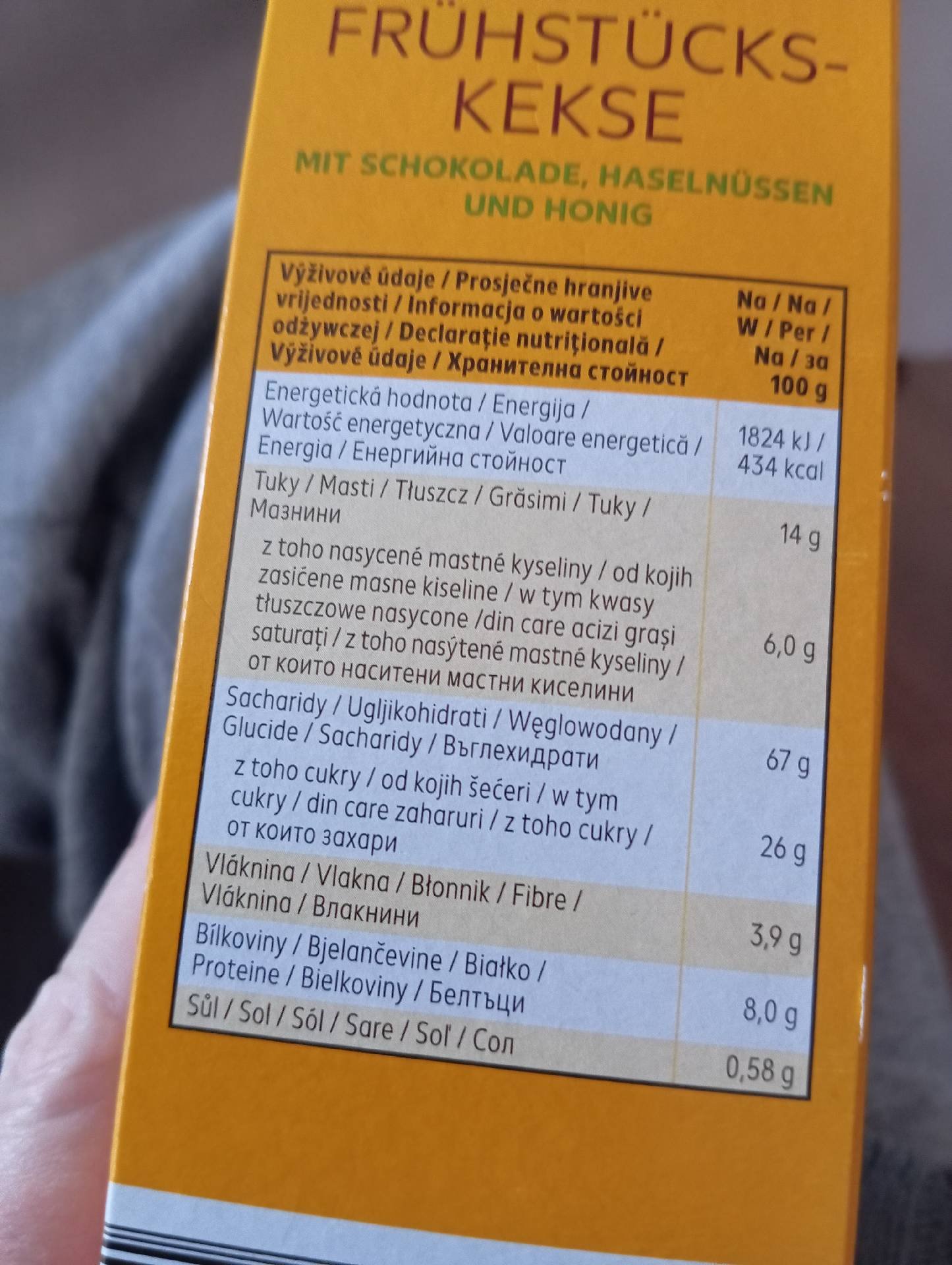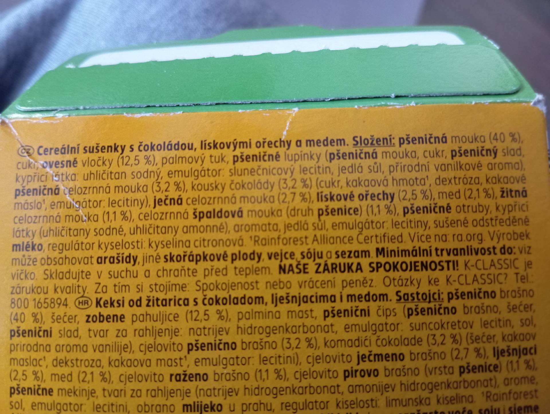 Cereální sušenky s čokoládou, lískovými ořechy a medem.