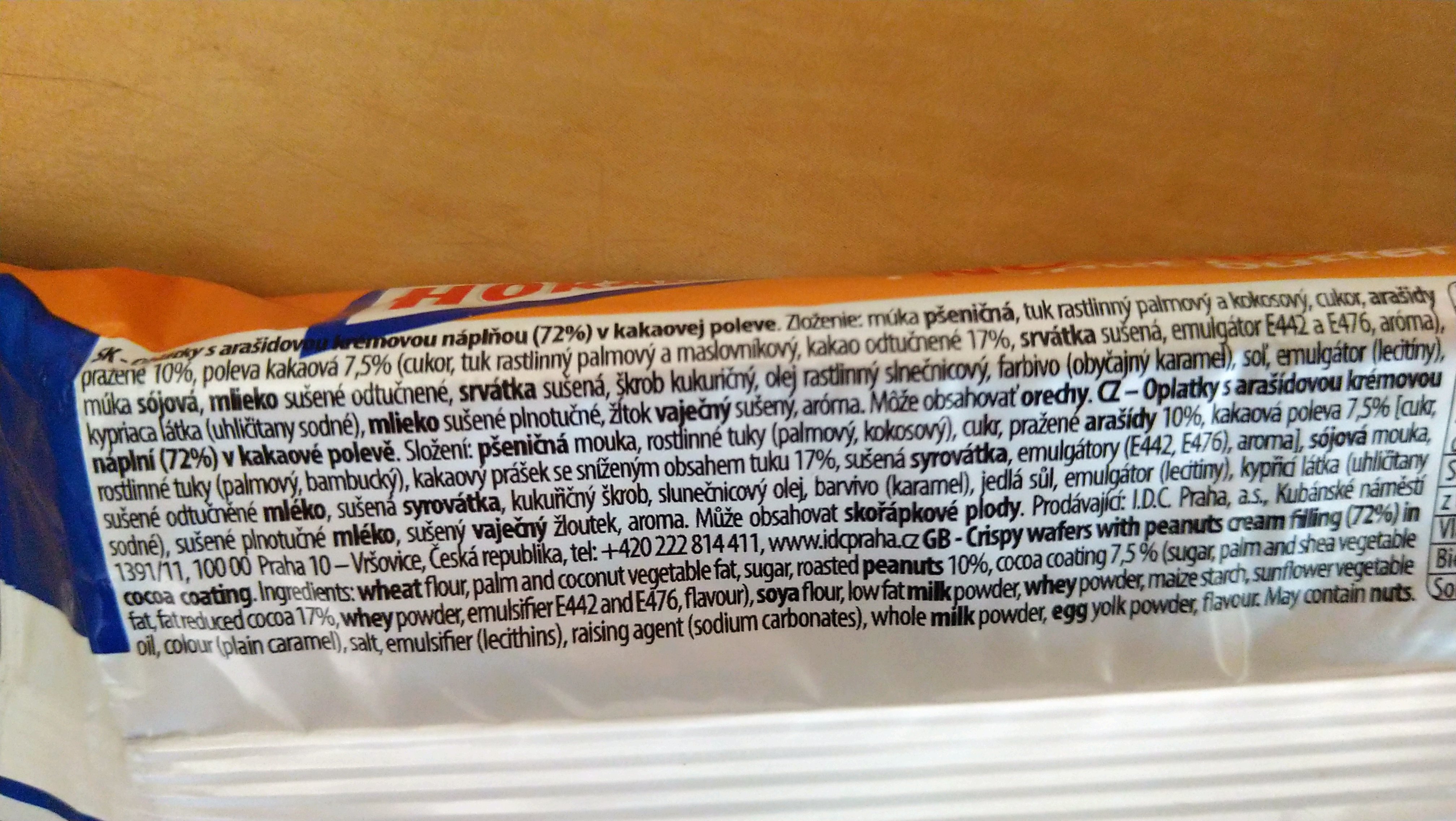 Oplatky s arašídovou krémovou náplní (72 %) v kakaové polevě.