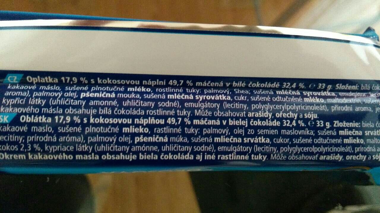 Delissa oplatka s kokosovou náplní máčená v bílé čokoládě. Oplatka 17,9 % s kokosovou náplní 49,7 % máčená v bílé čokoládě 32,4 %.