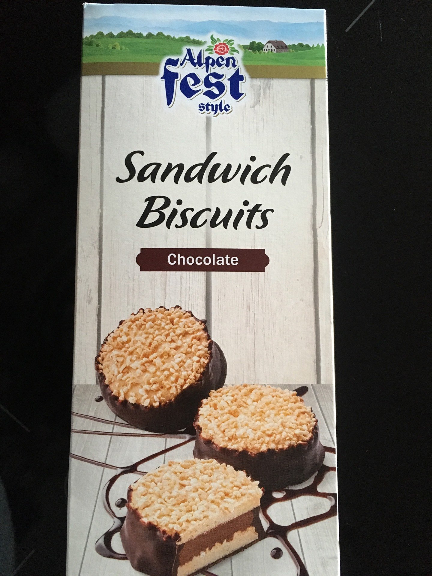 Sušenky s krémovou čokoládovou náplní 40% a hořkou čokoládou 28%.