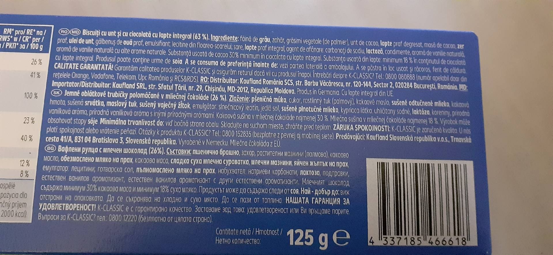 Jemné oplatkové trubičky máčené v mléčné čokoládě (26%).
