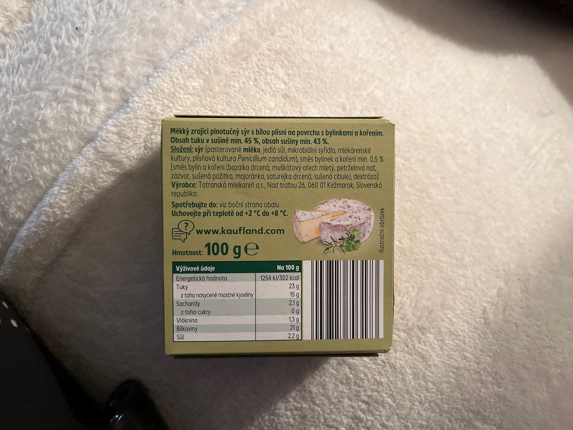 Měkký zrající sýr s bílou plísní na povrchu s bylinami a kořením.