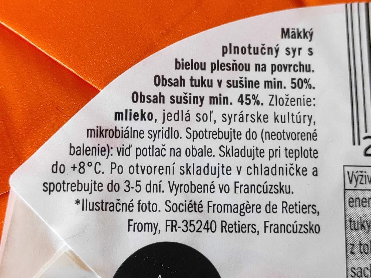 Měkký sýr plnotučný s bílou plísní na povrchu.
