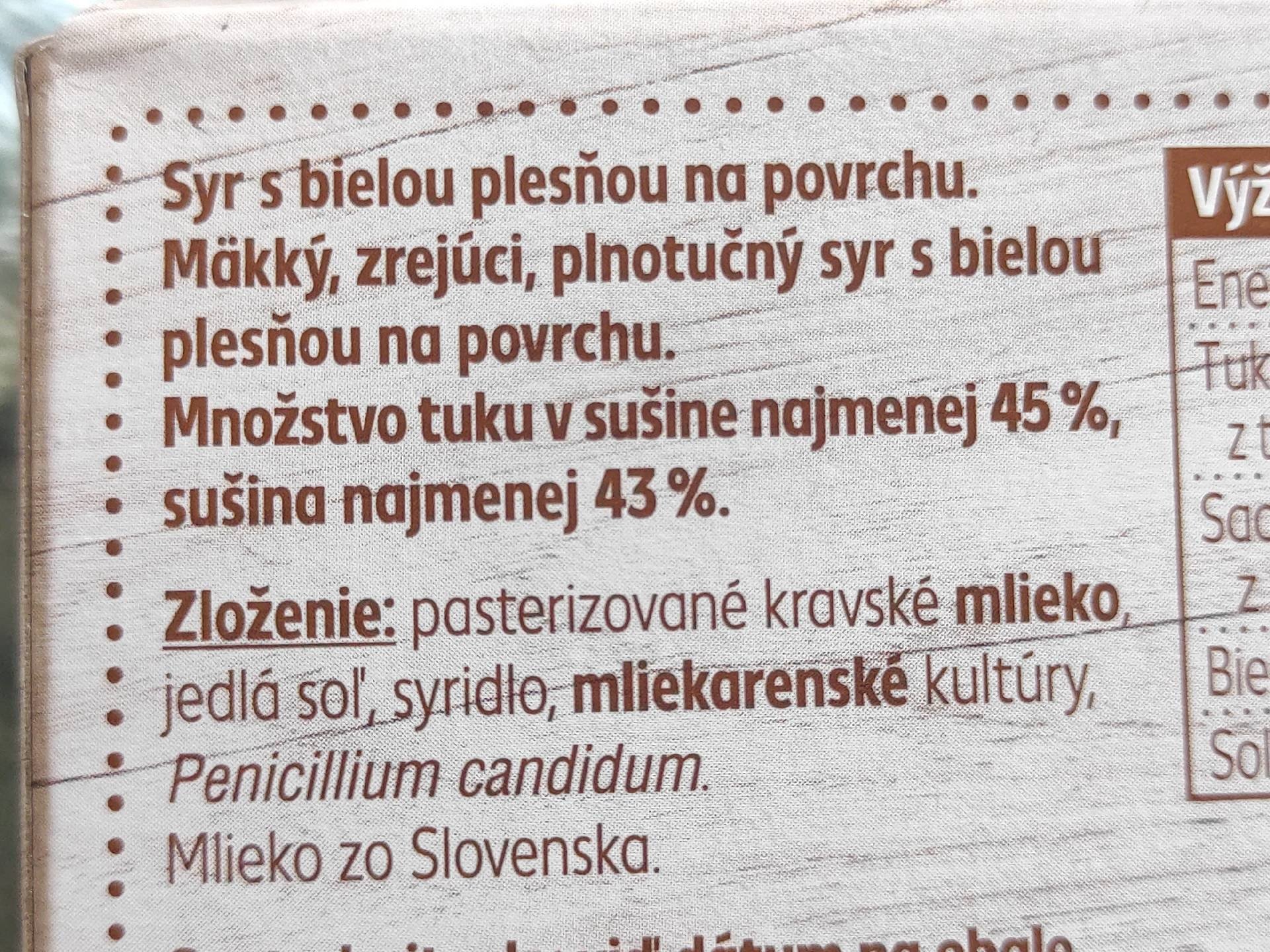 Měkký, zrající, plnotučný sýr s bílou plísni na povrchu.