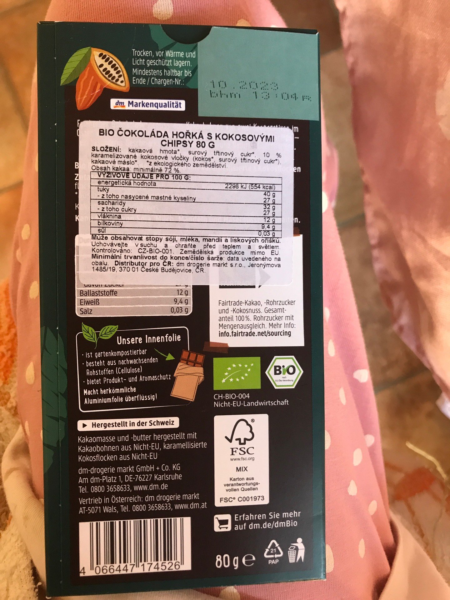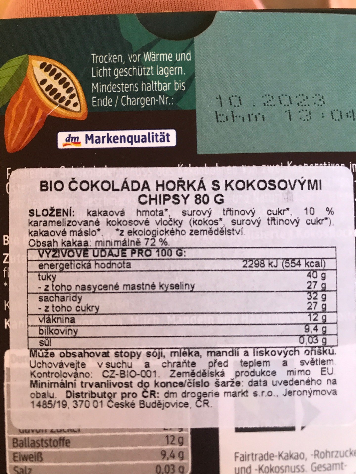 Obsah kakaové sušiny v hořké čokoládě min. 72%.