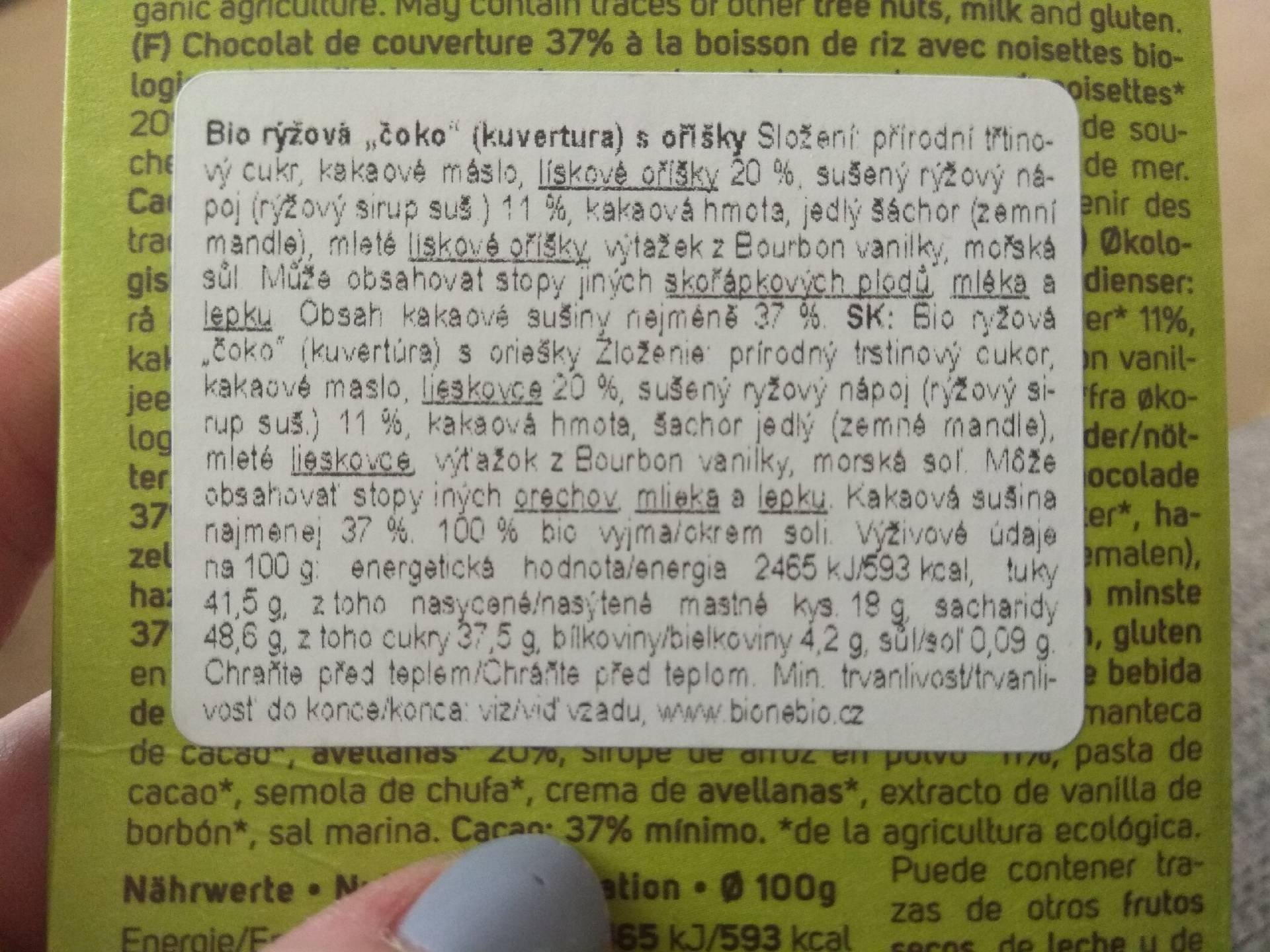 Bio rýžová "čoko" (kuvertura) s oříšky.