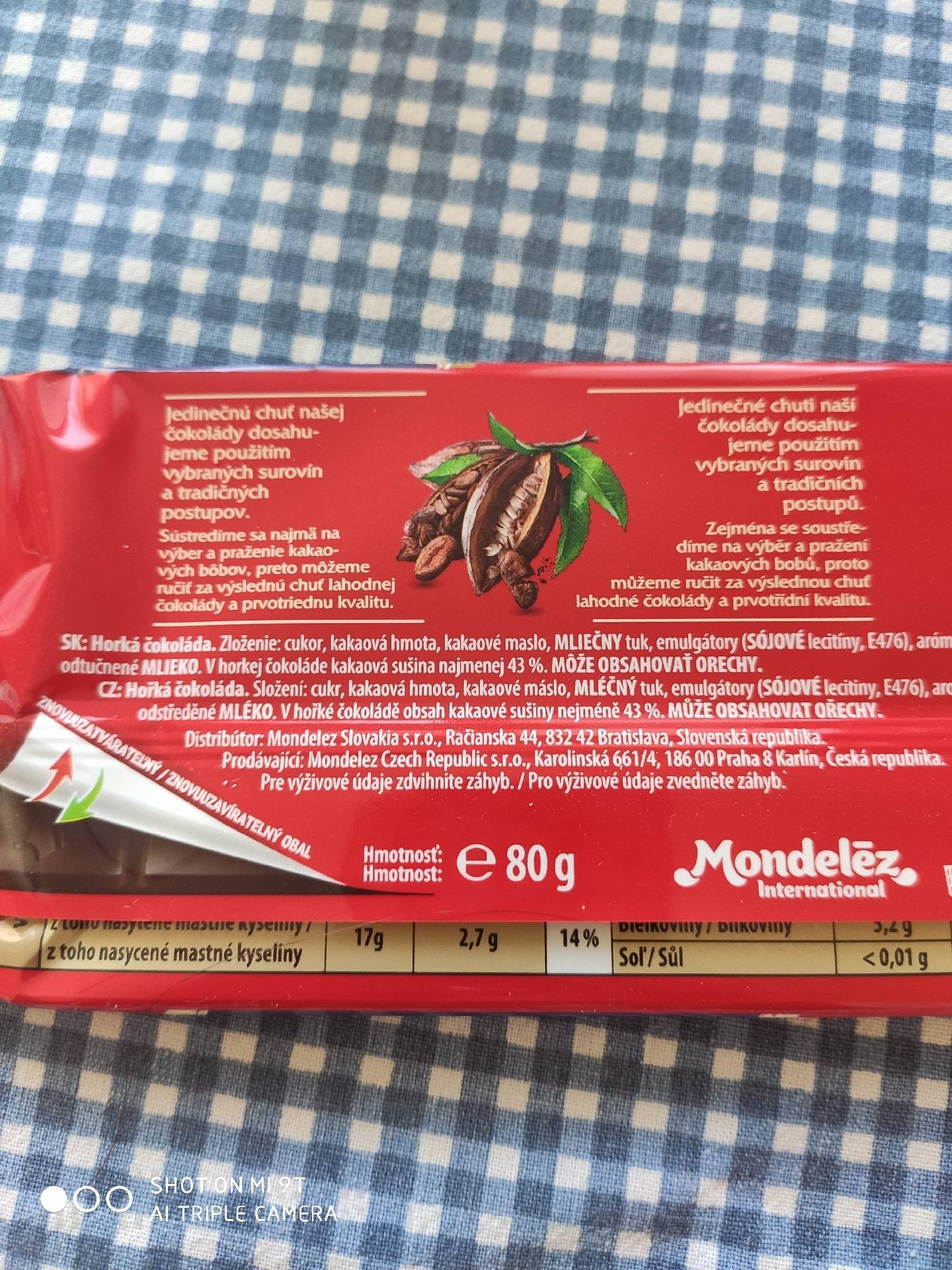 Hořká čokoláda. Obsah kakaové sušiny v hořké čokoládě min. 43%