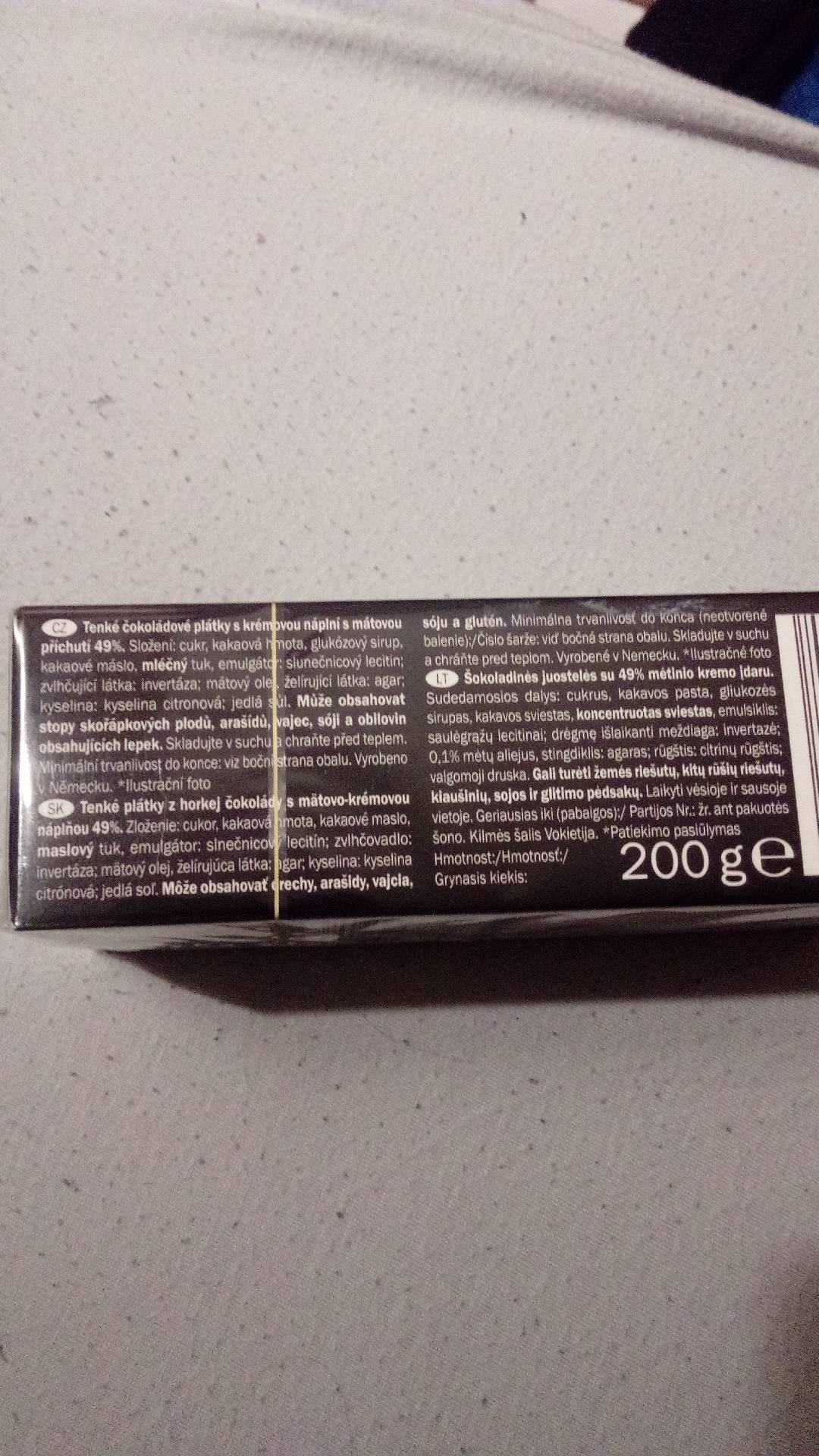 Tenké čokoládové plátky s krémovou náplní s mátovou příchutí 49%.