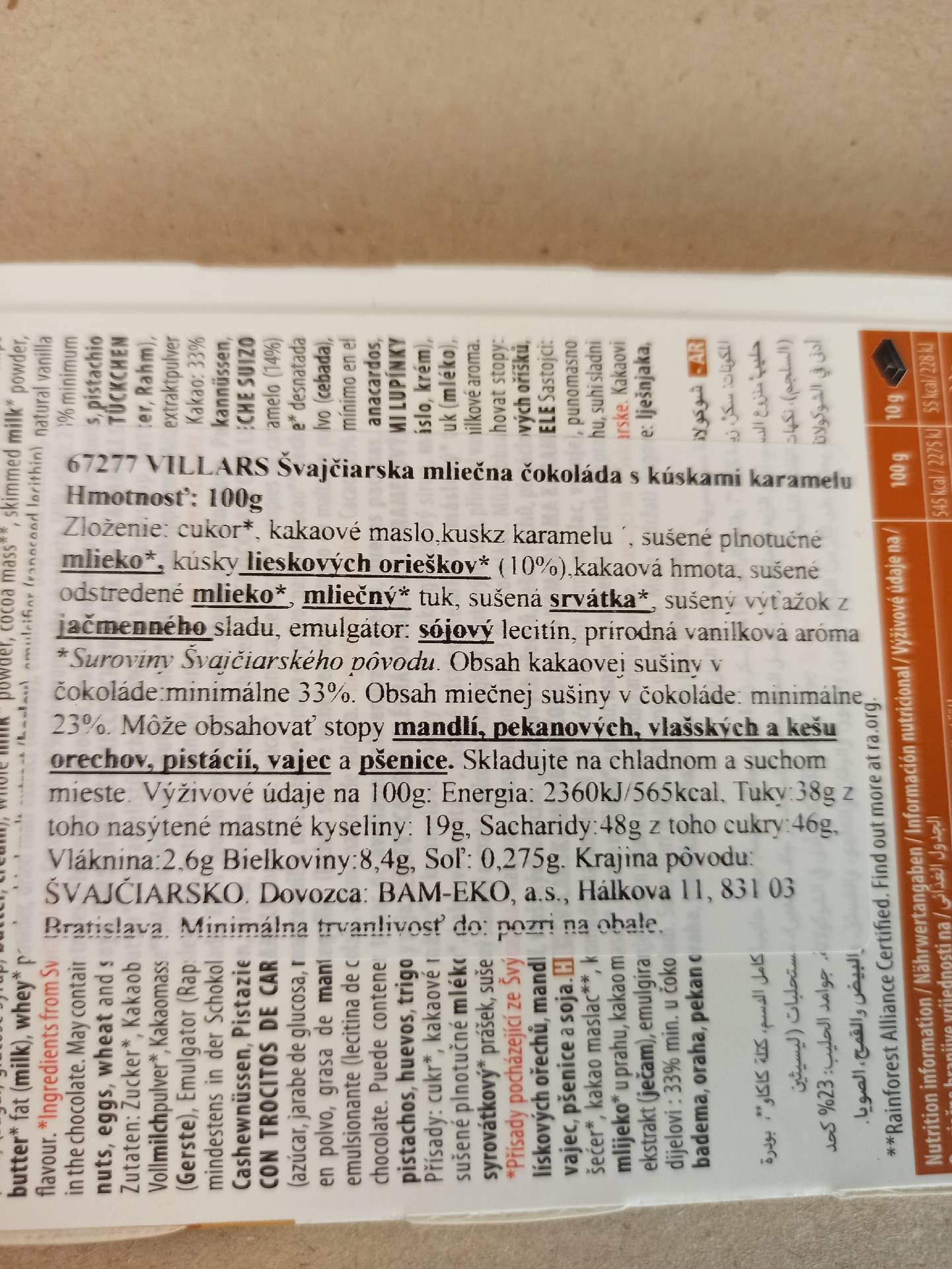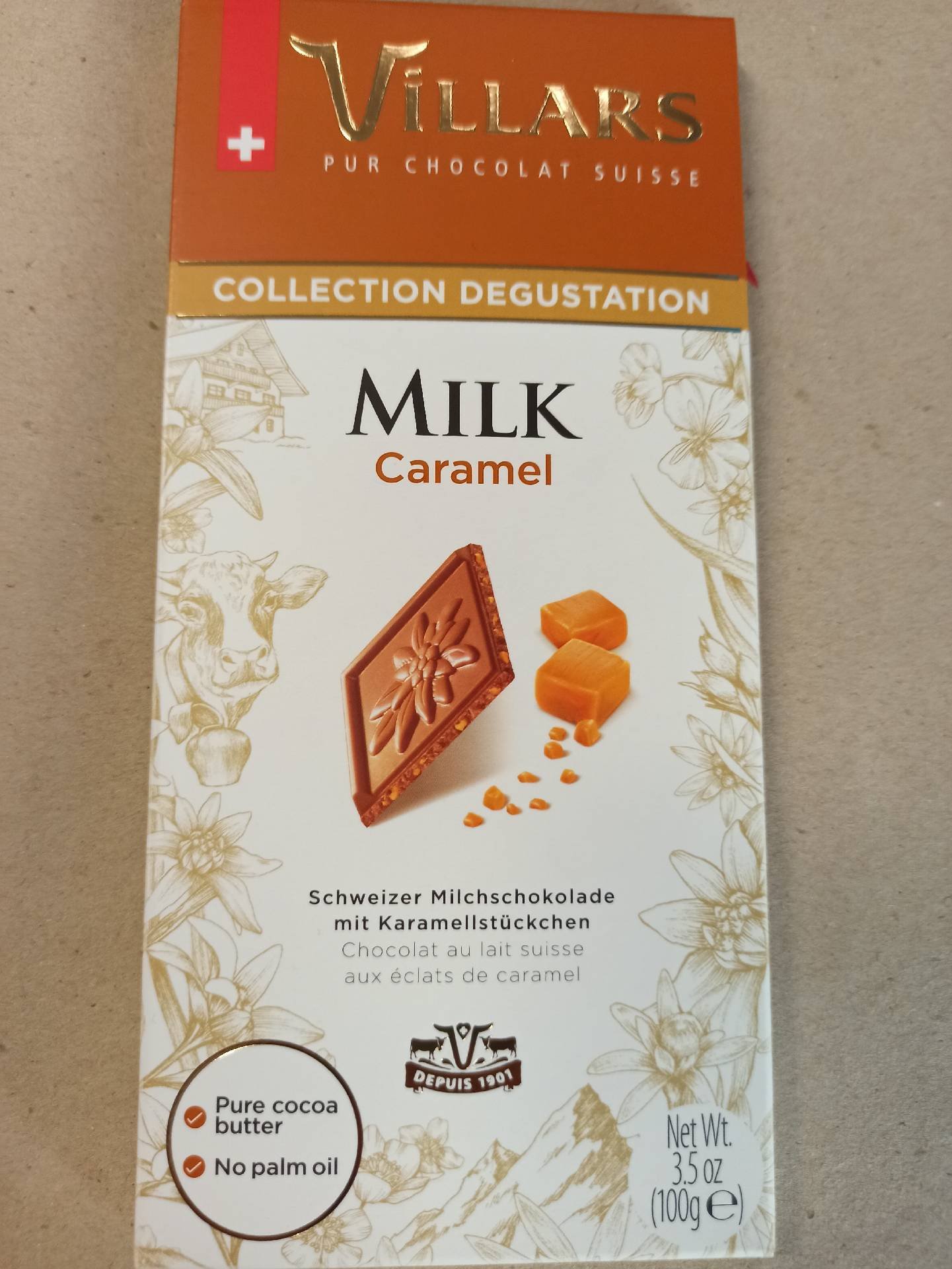 VILLARS Švýcarská mléčná čokoláda s kousky karamelu.
