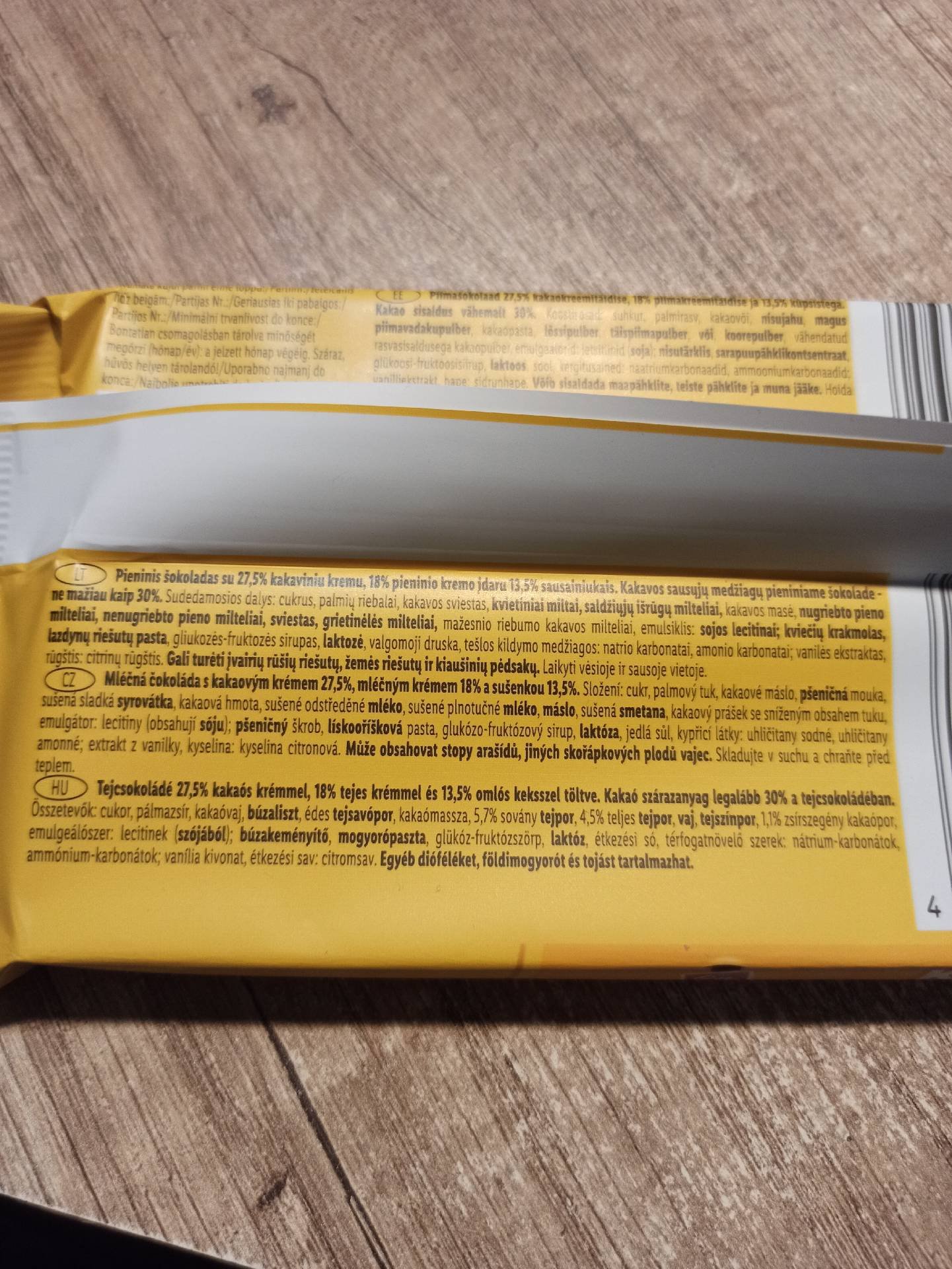 Mléčná čokoláda s kakaovým krémem 27,5%, mléčným krémem 18% a sušenkou 13,5%.