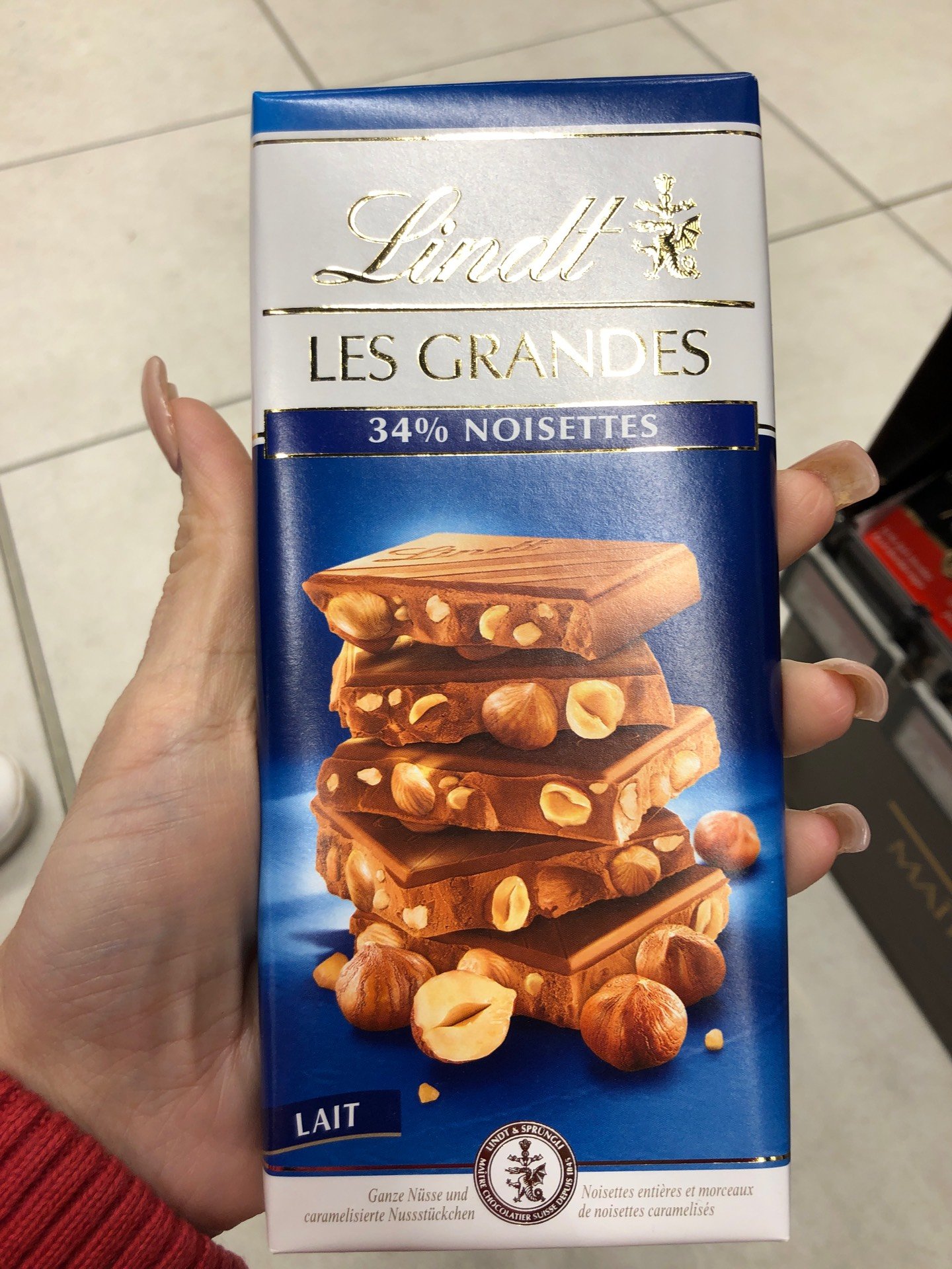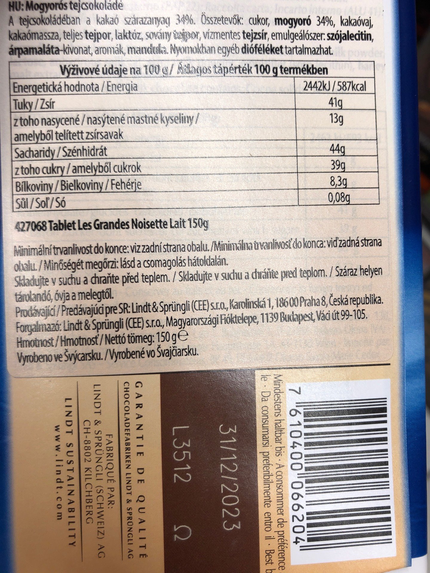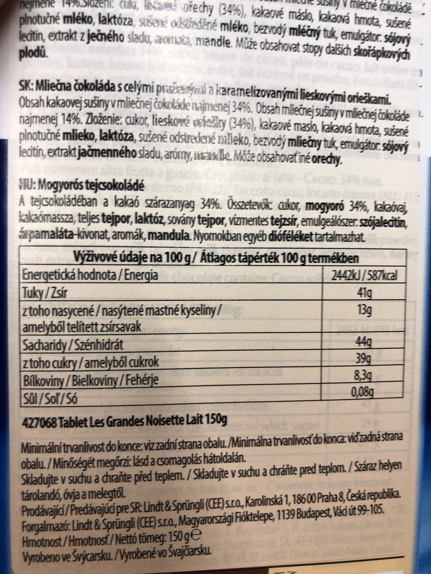 Mléčná čokoláda s celými praženými a karamelizovanými lískovými ořechy.
