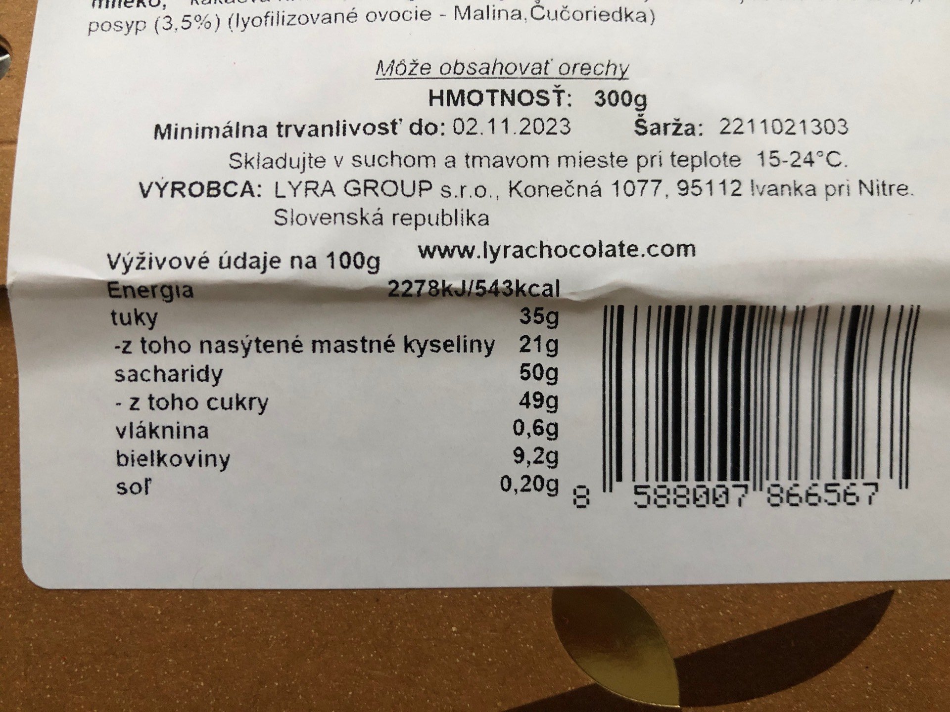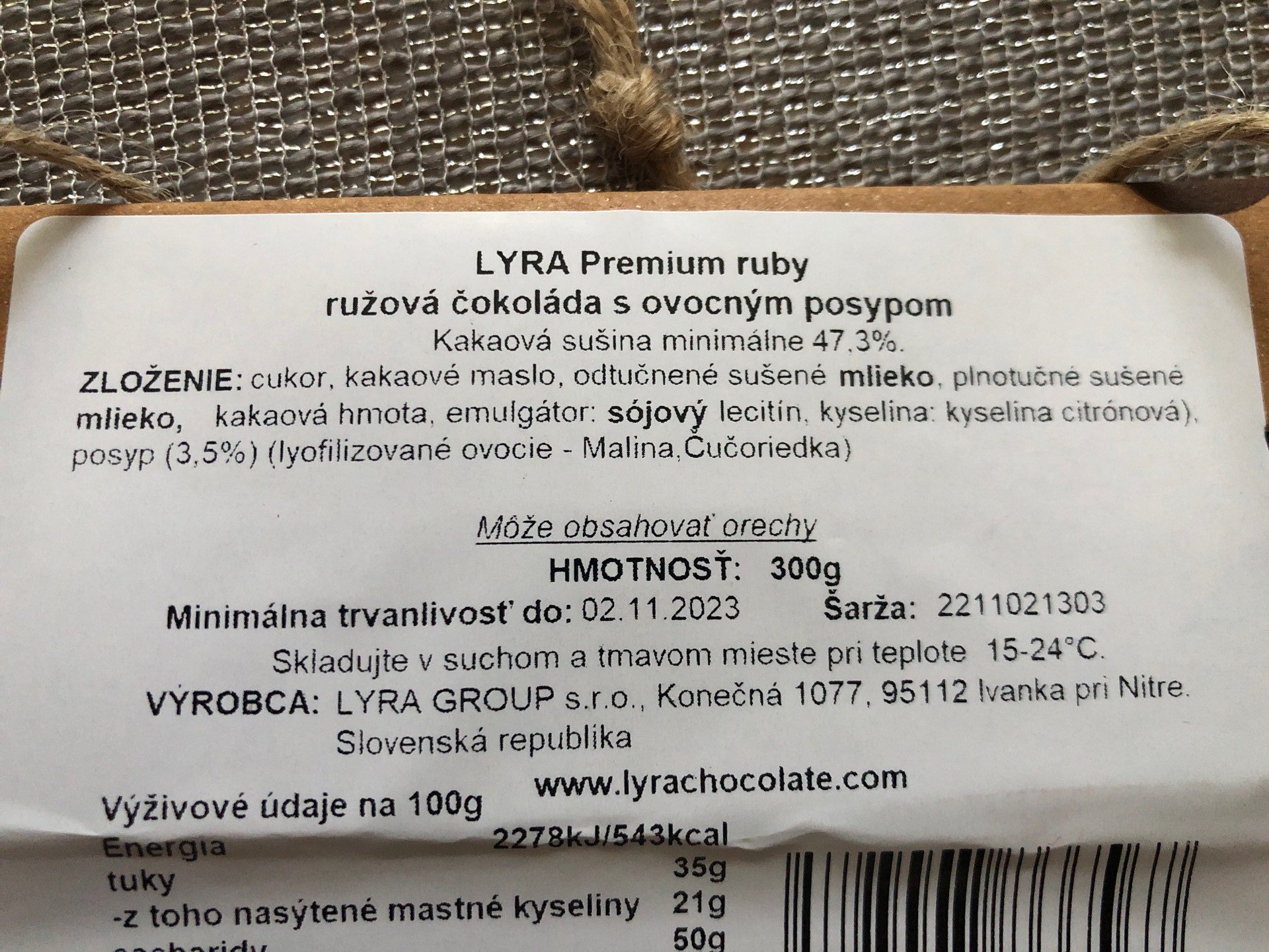 Lyra Premium ruby růžová čokoláda s ovocným posypem.