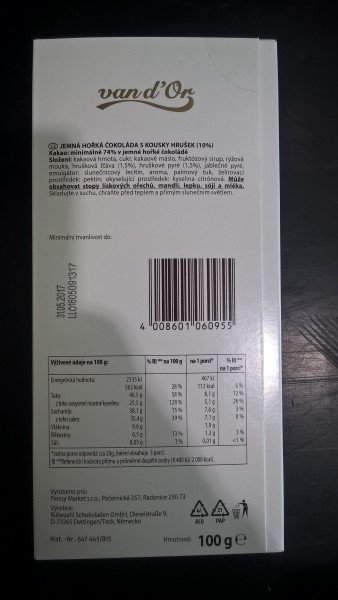 Jemná hořká čokoláda s kousky hrušek (10%). Kakao: minimálně 74% v jemné hořké čokoládě.