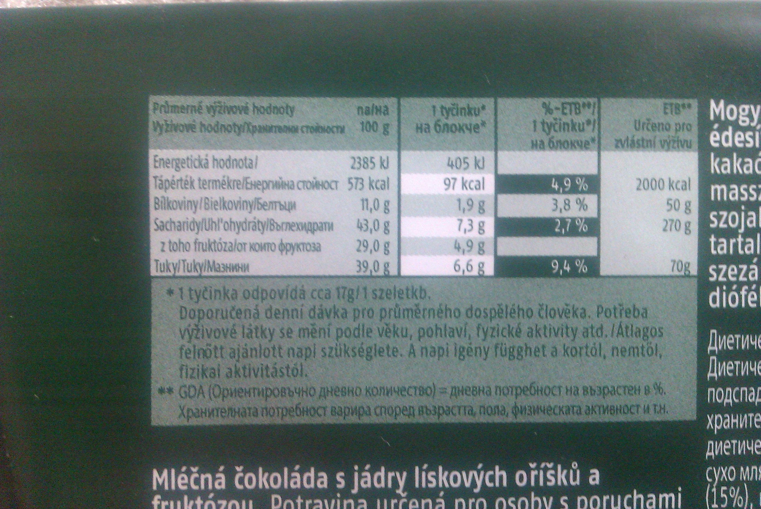 Mléčná čokoláda s jádry lískových oříšků a fruktózou. Potravina určená pro osoby s poruchami metabolismu sacharidů. Vhodné i pro diabetiky v rámci stanoveného dietního režimu. Neobsahuje lepek. Mléčná čokoláda: obsah kakaové sušiny nejméně 34% hm..
