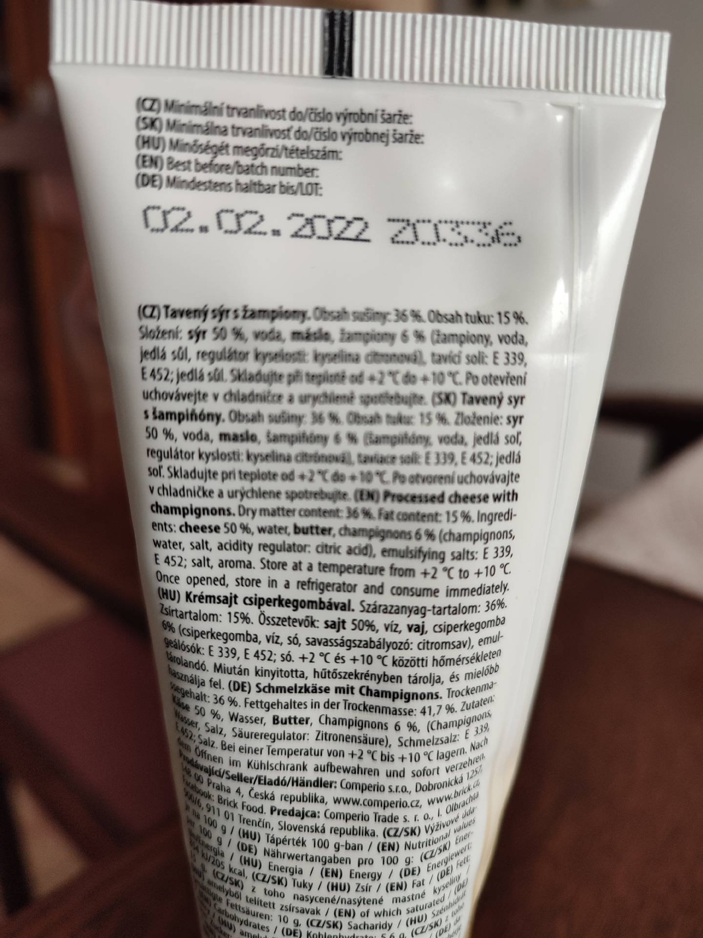 Obsah sušiny: 36%. Obsah tuku 15%.