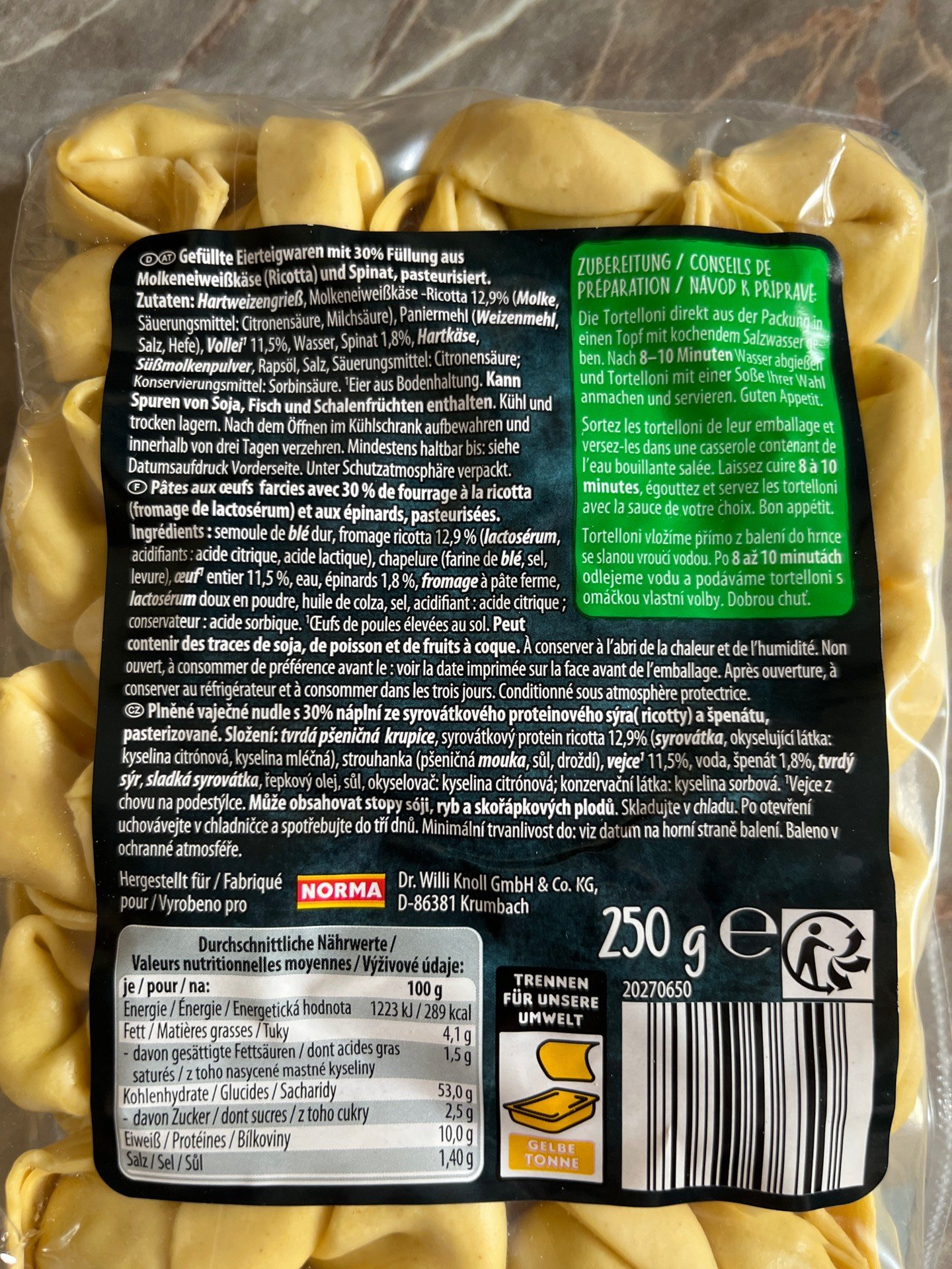 Plněné vaječné nudle s 30% náplní ze syrovátkového proteinového sýra (ricotty) a špenátu, pasterizované.