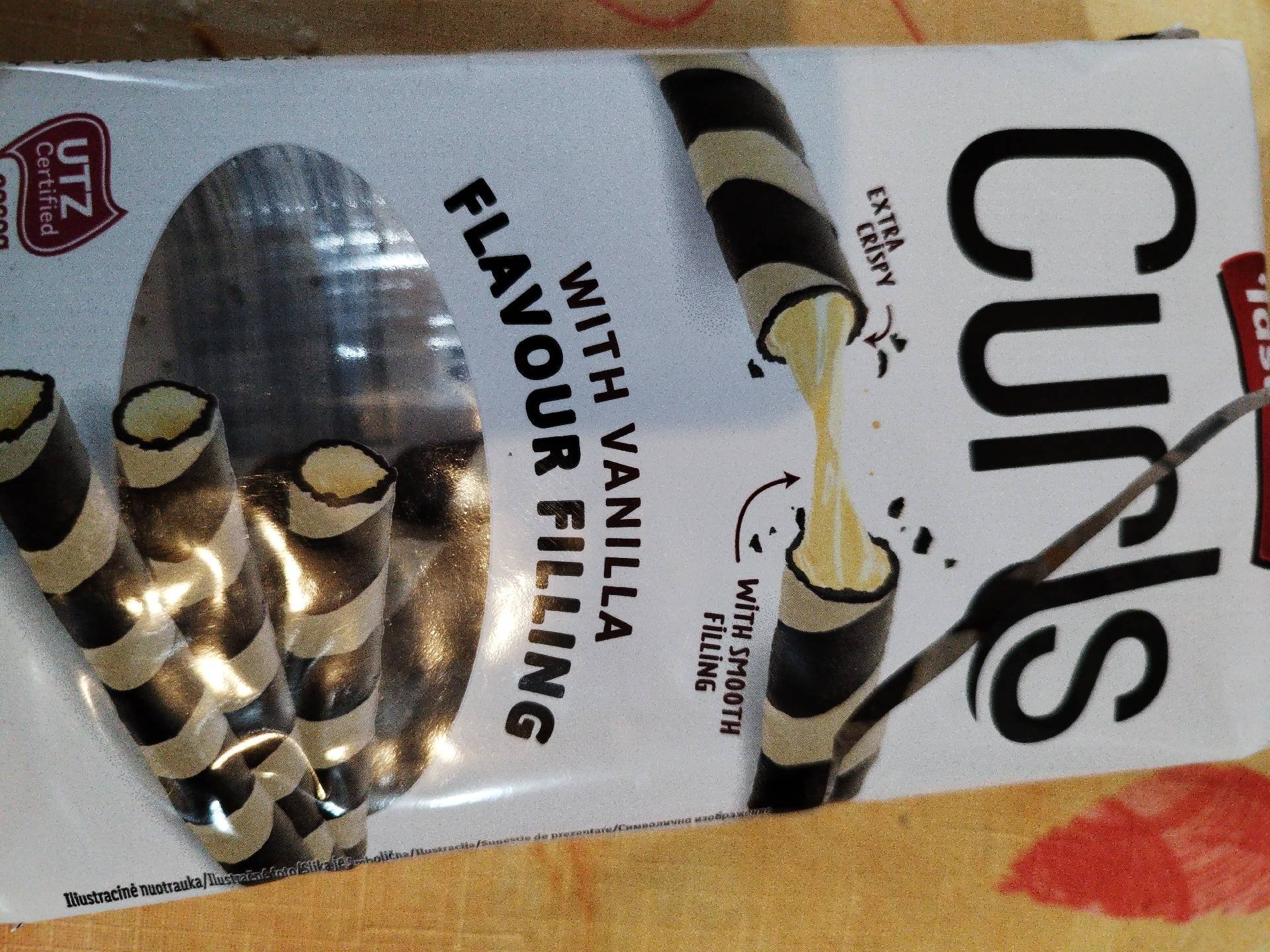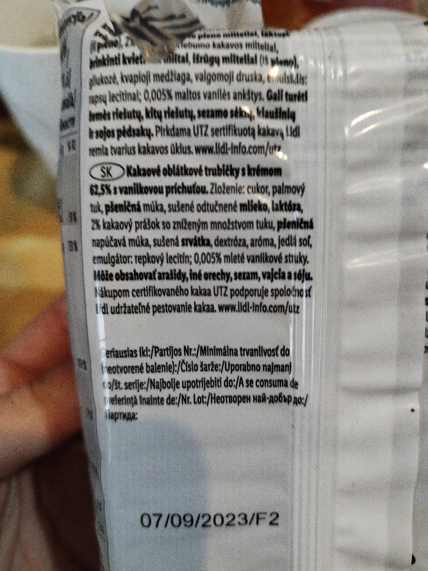Kakaové oplatkové tyčinky s krémem 62,5% s vanilkovou příchutí.