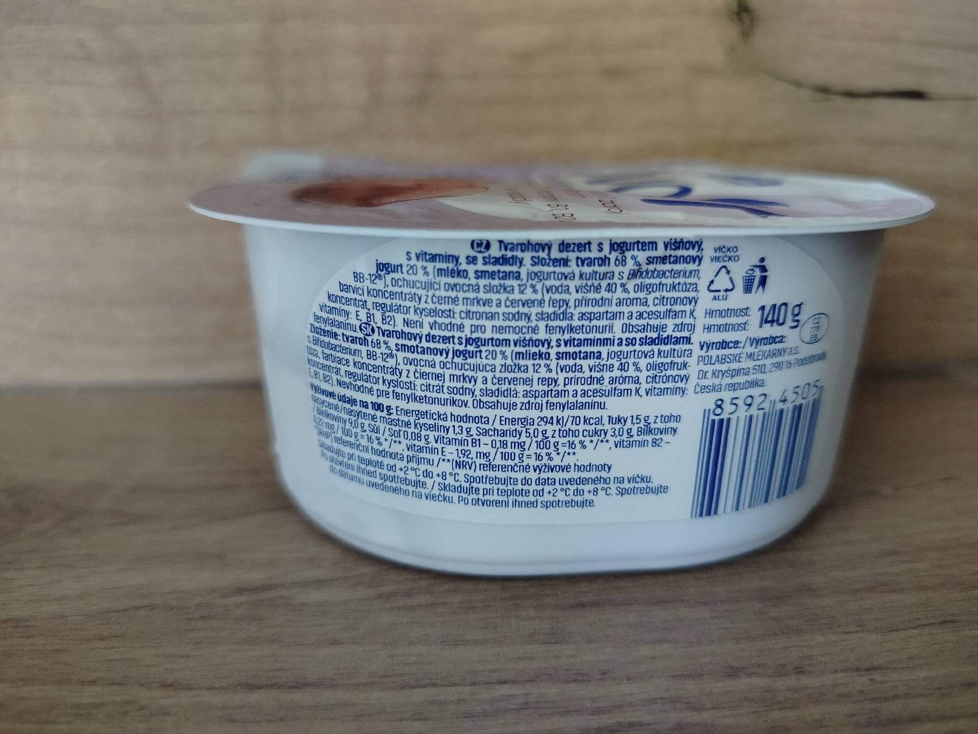 Tvarohový dezert s jogurtem višňový, s vitamíny, se sladidly.