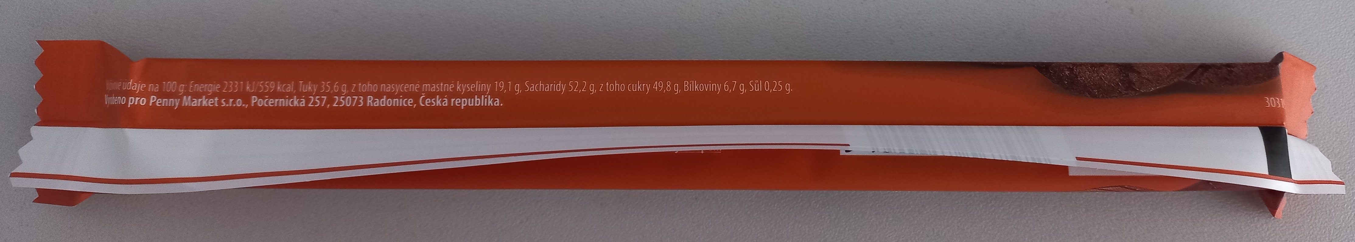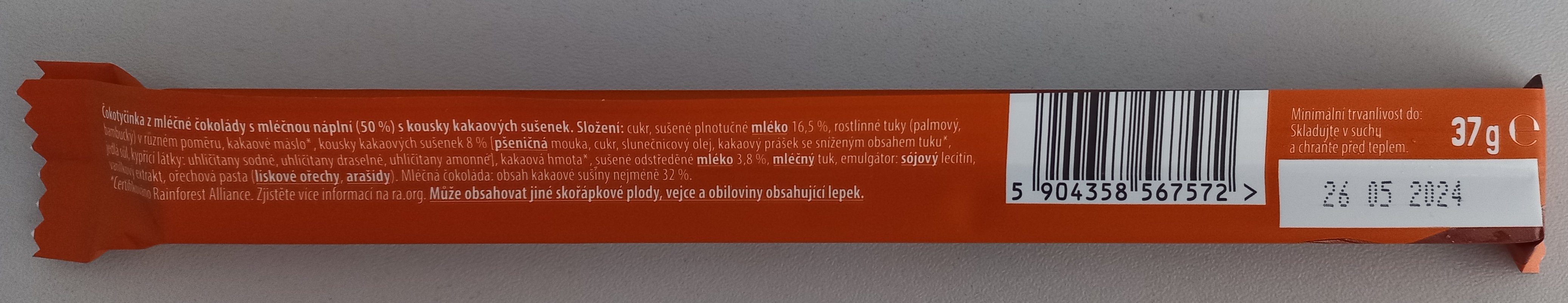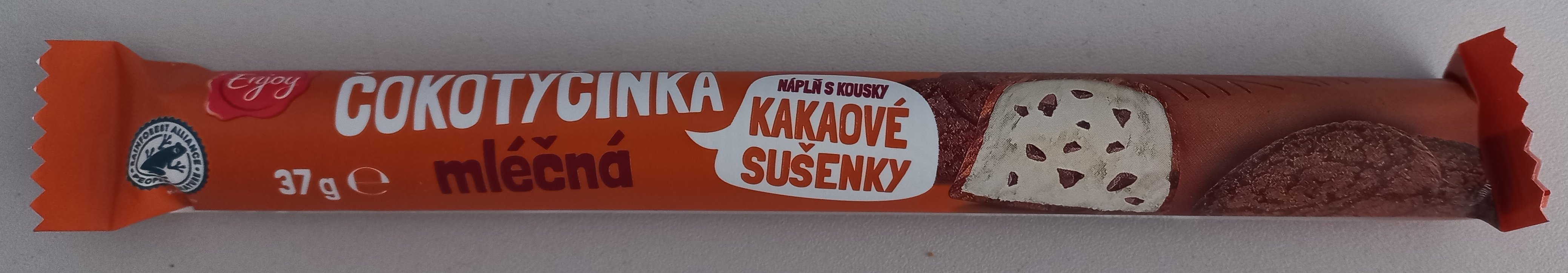 Čokotyčinka z mléčné čokolády s mléčnou náplní (50%) s kousky kakaových sušenek.
