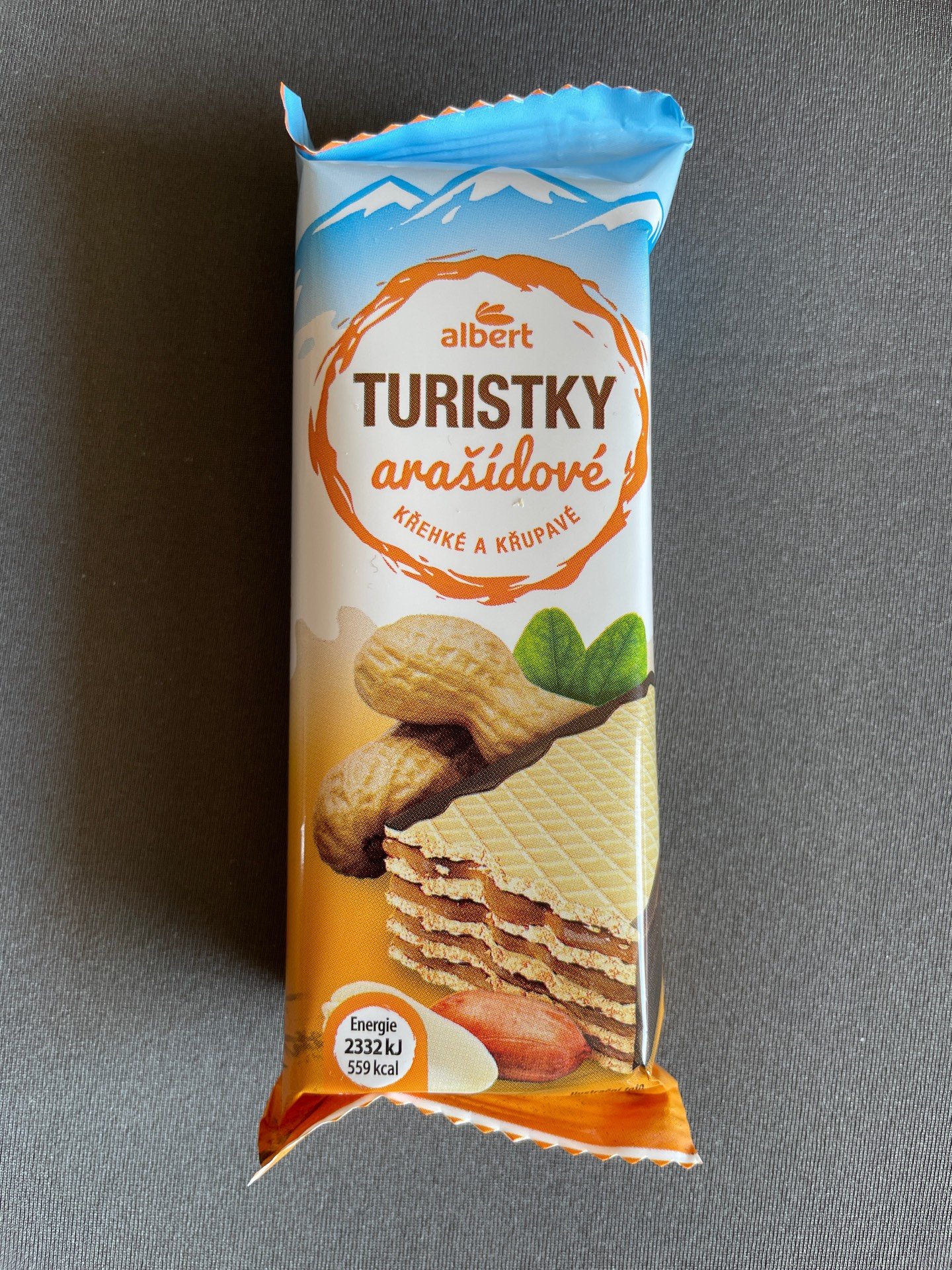 Oplatka s arašídovou náplní, máčená po obvodu v tmavé polevě.