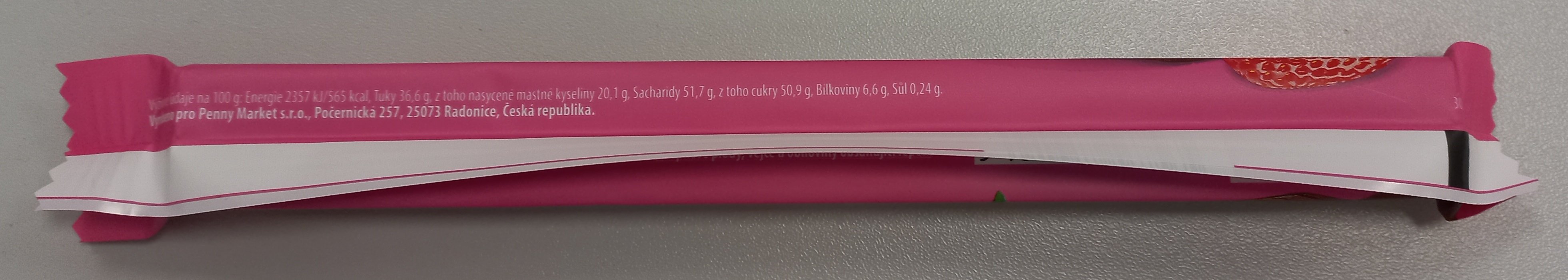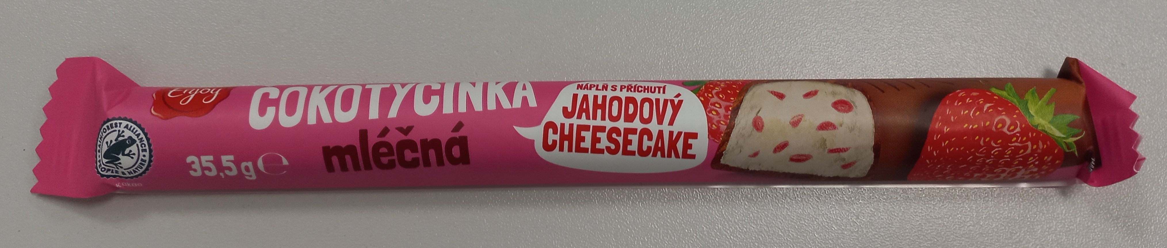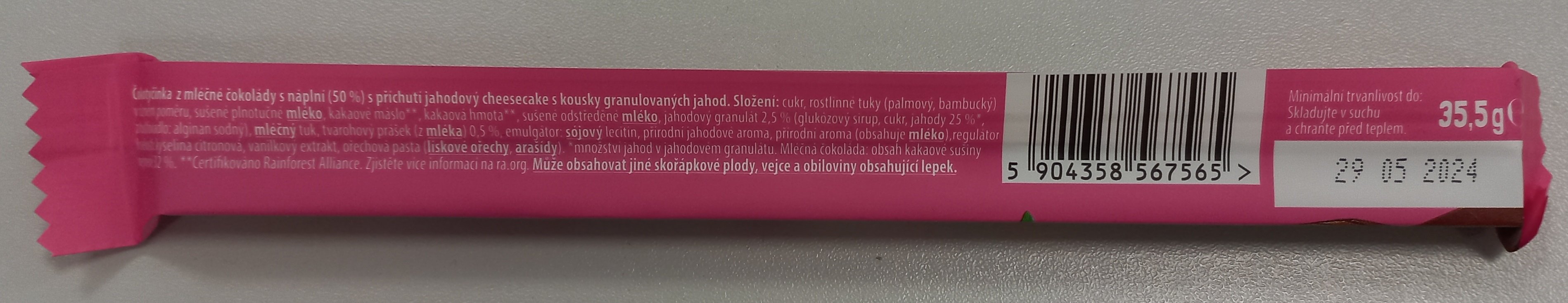 Čokotyčinka z mléčné čokolády náplní (50%) s příchutí jahodový cheesecake s kousky granulovaných jahod.