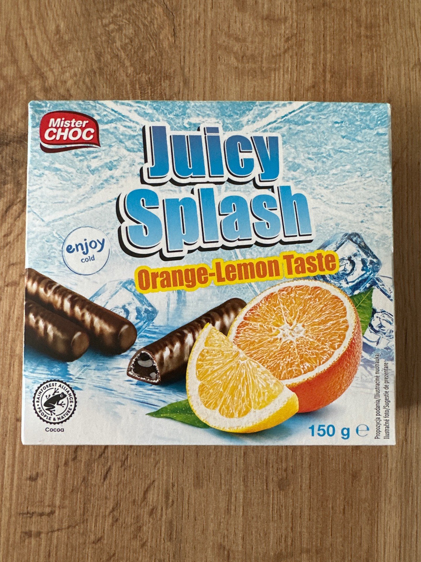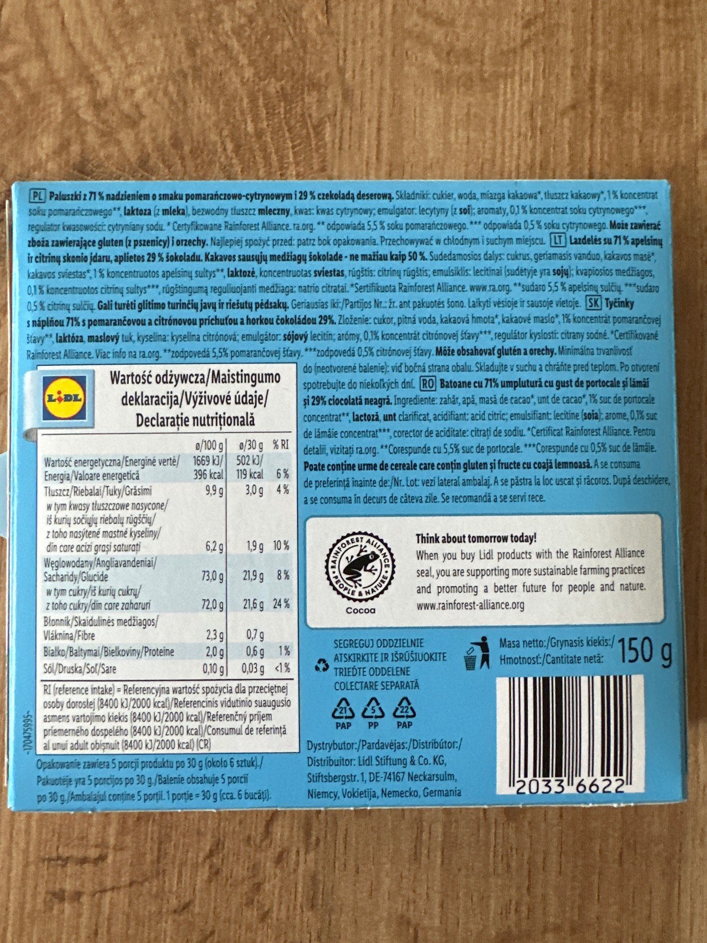 Tyčinky s náplní 71% s pomerančovou a citronovou příchutí a hořkou čokoládou 29%.